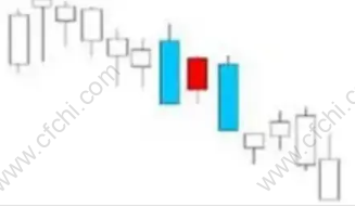图中为两阴夹一阳的K线形态,两阴夹一阳的K线组合形态由两根较长的阴线和一根较短的阳线组成。阳线夹在阴线之中。