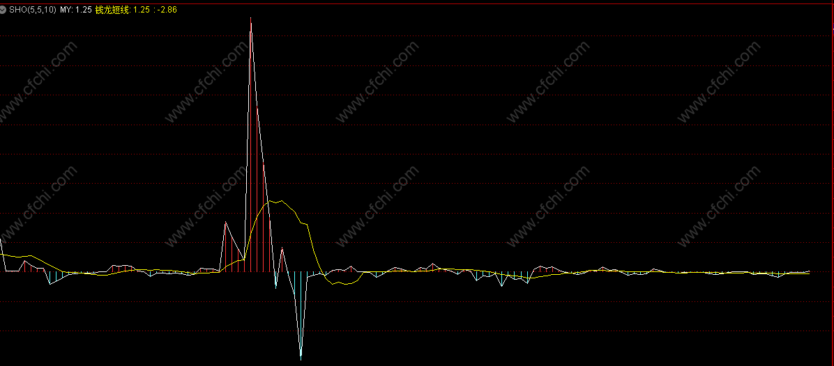 钱龙短线指标(SHT)表现形式类似平滑异同移动平均线(MACD),由白色指标线和黄色均线构成,同时用红、绿色的柱状线表示指标强、弱趋势。指标、均线、柱状线都以0轴为强、弱势的区分参考线。如图: