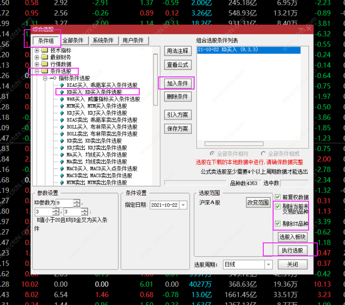 二、选择条件组--选择条件选股分类--选择一个条件选股指标--点击加入条件--勾选剔除的两个条件项--点击执行选股
