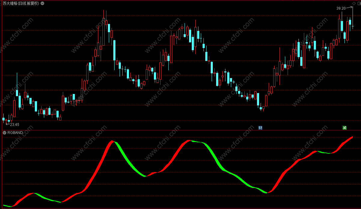 RGBAND红绿波段指标由一根线+两种颜色组成,红色代表上涨趋势、绿色代表下跌趋势。