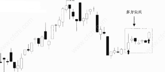 (1)长上影线的阳线,常常表示上涨受阻。随后的多根K线开始回调,显示空头进场。这两个信号均代表后市看跌。然而,再次出现一根阳线,冲破前期高点,证明之前的走势为诱空。因此,就整个组合而言,多方尖兵为看多信号。