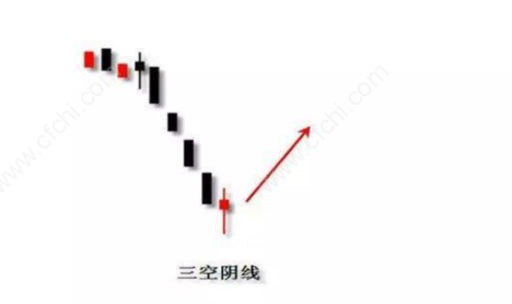 三空阴线k线组合一般出现在股价下跌中,阴线伴随着缺口,跳空低开低走,连续向下的三个跳空缺口,虽然空头力量强大,但过度下跌对做空能量消耗极大,当空头能量消耗竭尽之时,价格容易 止跌转强而出现反弹行情。所以,投资者在价格连续大幅下跌之后,出现的三空阴线不应恐慌割肉出局,反而应当逆向思维,择机介入抢反弹。