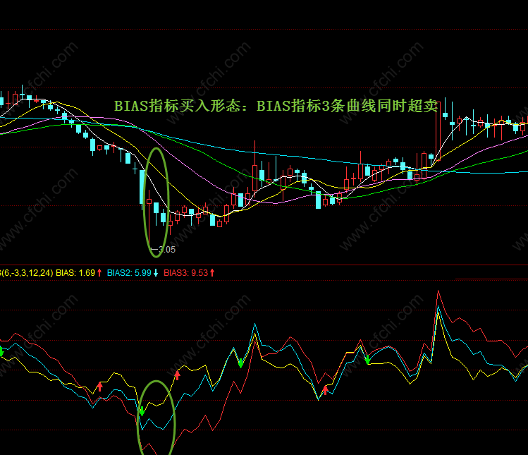 2、三条BIAS曲线同时进入超卖区间的看涨信号最强。如果其中两条进入超卖区间,另一条没有,说明市场并没有进入空方极端强势的状态。这虽然也是买入信号,但投资者买入股票要冒更大风险。