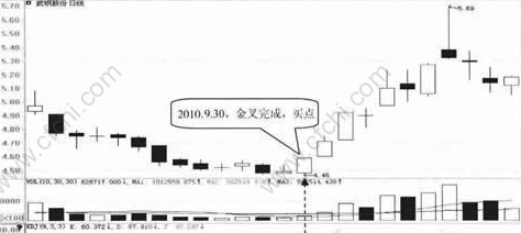 2.当KDJ指标的金叉出现在其他位置时,同样是看涨买入信号。不过这种买入信号没有超卖区域的金叉那么强烈。
