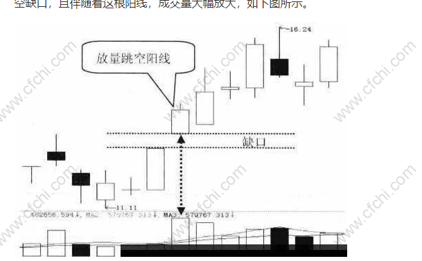 股价跳空上涨,最终收出一根阳线,这根阳线的最低价高于之前一根K线的最高价,留下了跳空缺口,且伴随着这根阳线,成交量大幅放大,如下图所示。