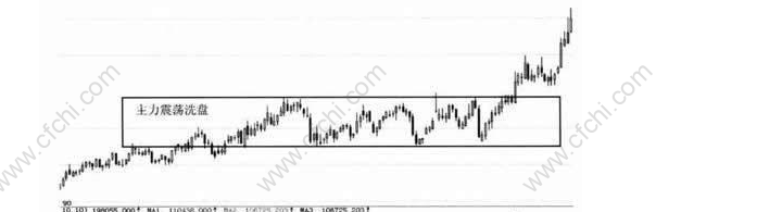主力震荡洗盘是指主力将股价拉升一段时间后,让股价在高位一个稳固的区间内长期横盘震荡。主力震荡洗盘的形态如下图所示。