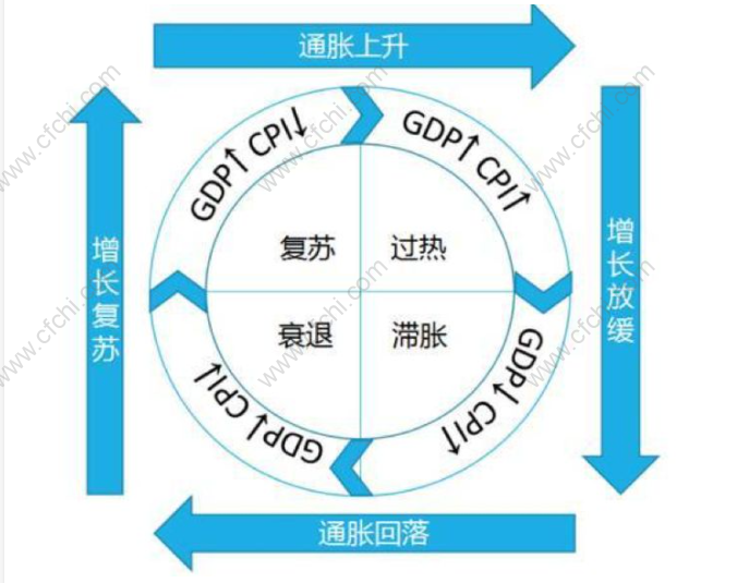 3、过热阶段(经济上行,通胀上行) 在此阶段,通胀上升增加了持有现金的机会成本,可能出台的加息政策降低了债券的吸引力,股票的配置价值相对较强,而商品则将明显走牛。总的来说,大宗商品>股票>现金/债券。