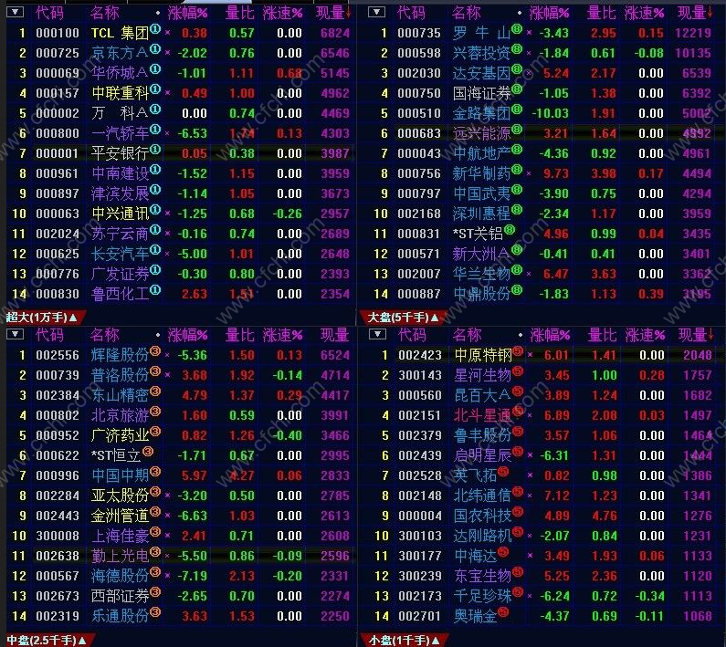 4 、超大盘: 流通股本>10亿 异动现量>=10000手