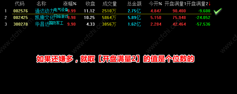 第一步:9.25-9.30使用本指标对全部A股进行降序排序,保留【开盘满量1】大于40,【开盘满量2】小于0;