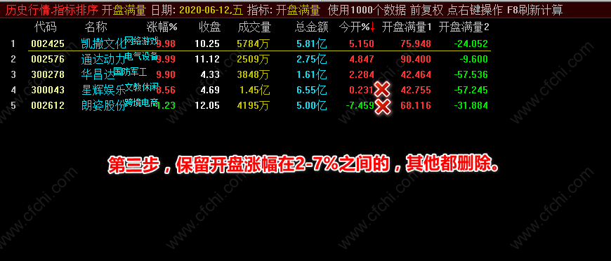 第三步,保留开盘涨幅在2-7%之间的,其他都删除。