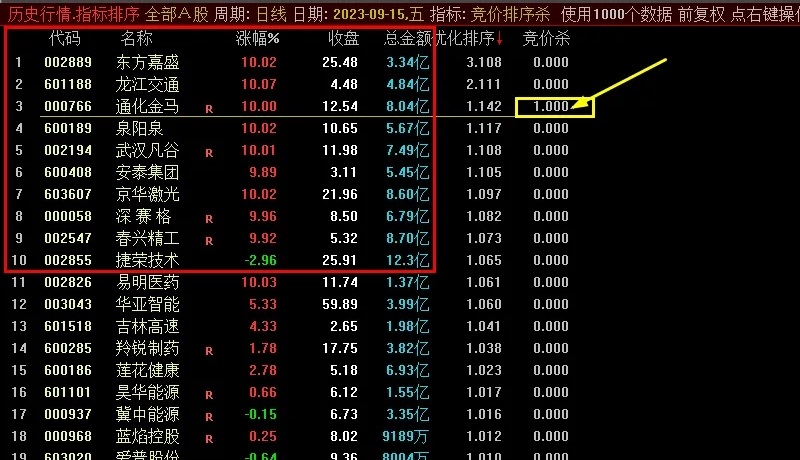 9点25分按.401排序,可用于早盘竞价排序或盘后排序,重点关注前10名,尤其是前5名,如果出现竞价杀成立,概率很高。只能用于当天,回测数值会变化!