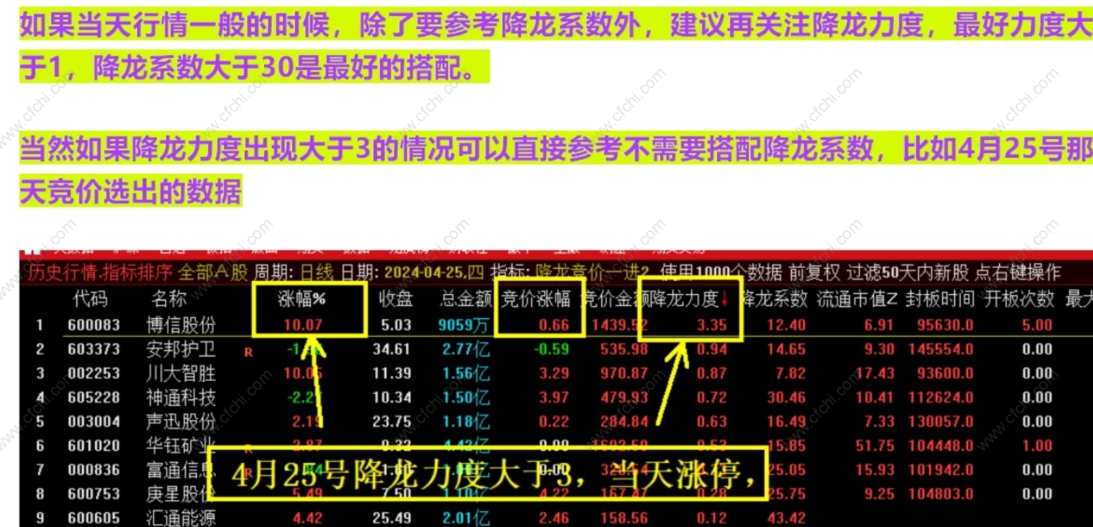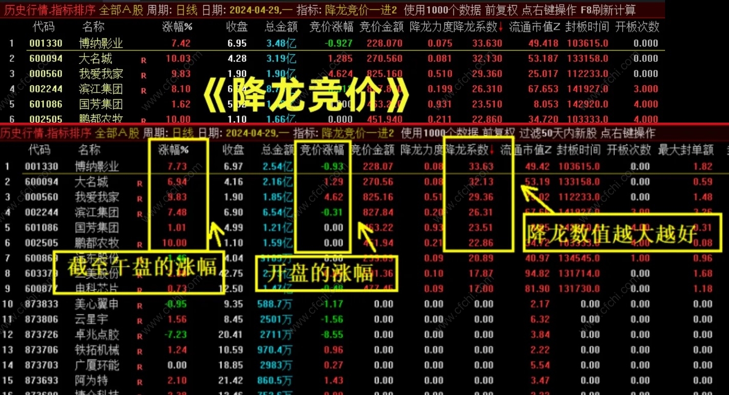 使用方法:每天交易时间的9点25-9点30分之间打开排序界面,按F8排序刷新即可,取降龙力度和降龙系数这两个的排名,建议以降龙系数为主;