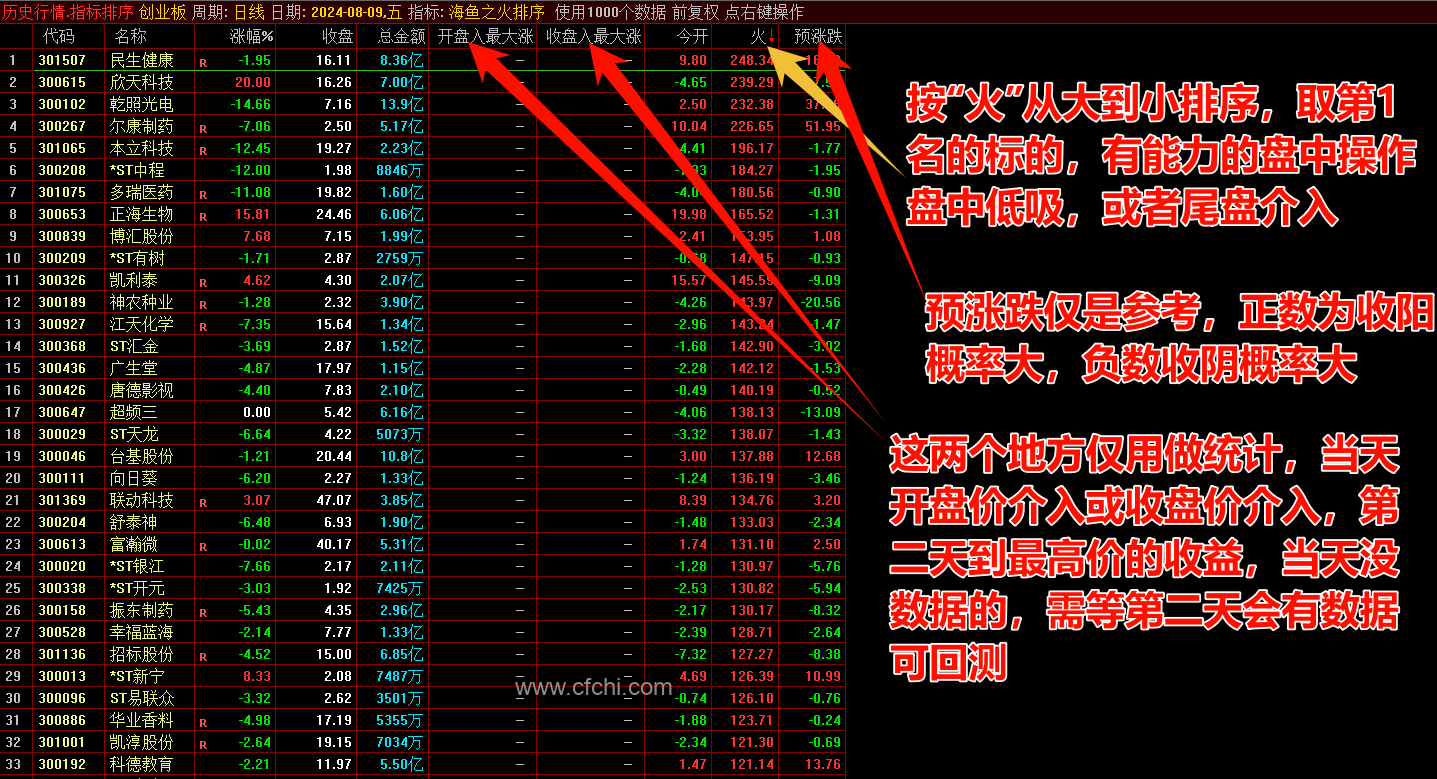 本指标不限制其他版块 ,但是个人喜欢创业板,只研究创业板 。火排序成功率比较高,“预测涨跌”概率就是60%左右 。不要一开盘就买进,最好是尾盘买入,但是可以在根据盘面等情况确定今天上涨的概率非常大 ,甚至会涨停 ,可以盘中逢低买入 。
