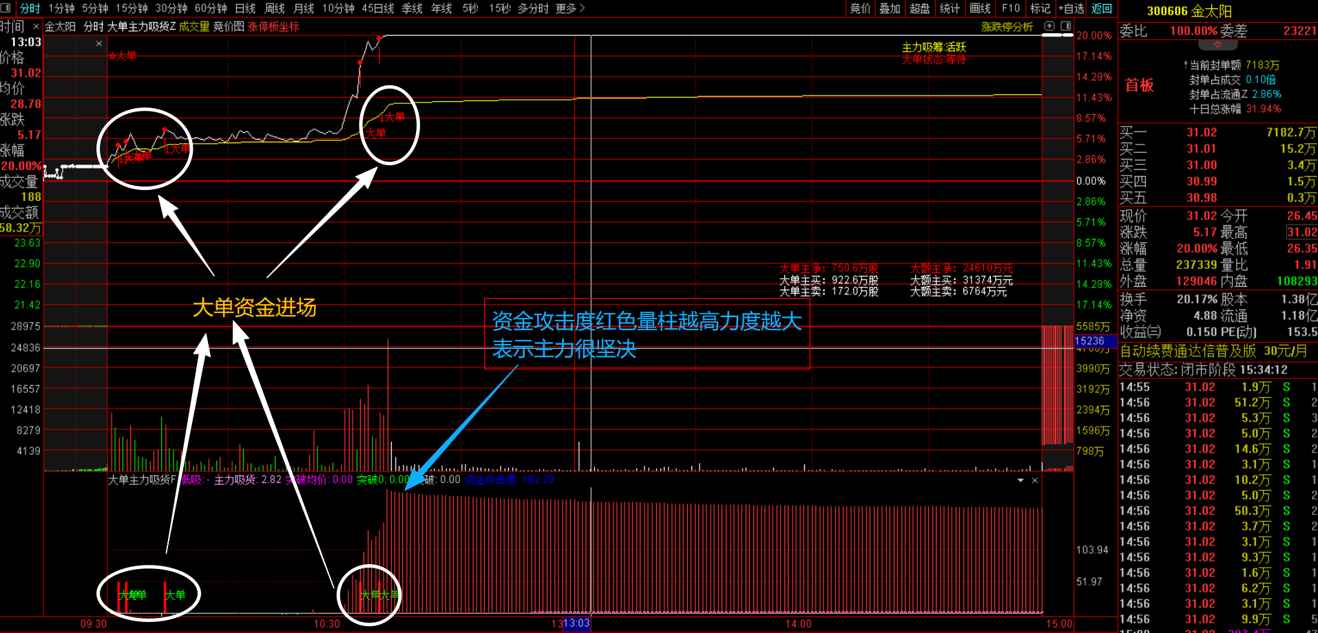 (通达信【大单主力吸货】分时主副图指标 分时利器—主力吸筹+主力大单资金+资金攻击度 三重信号埋伏直击涨停)