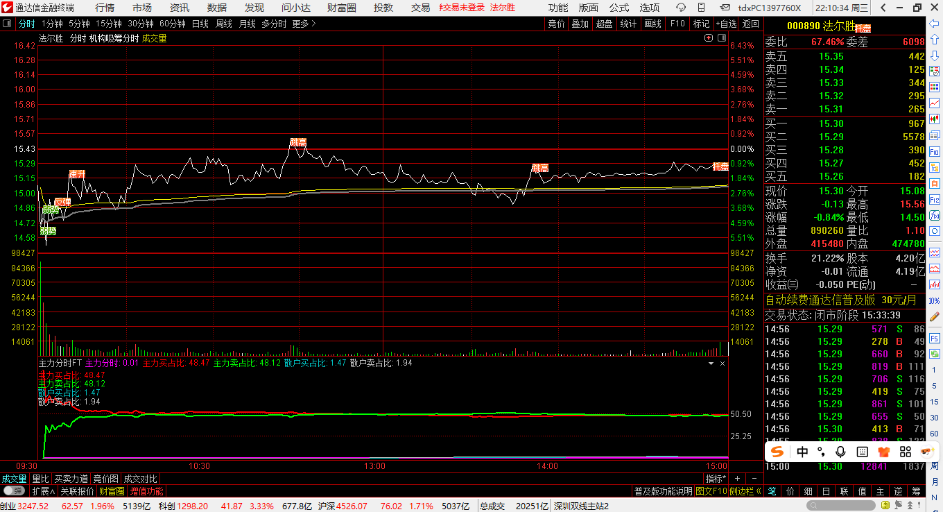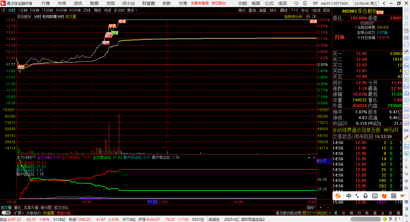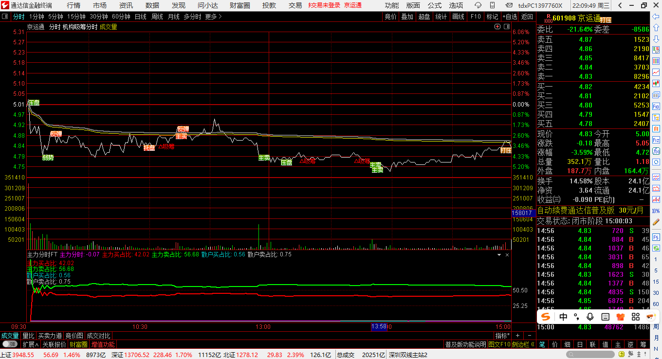 3.主力买占比<50%,而且,红线与绿线“相当”,当日基本上是震荡。