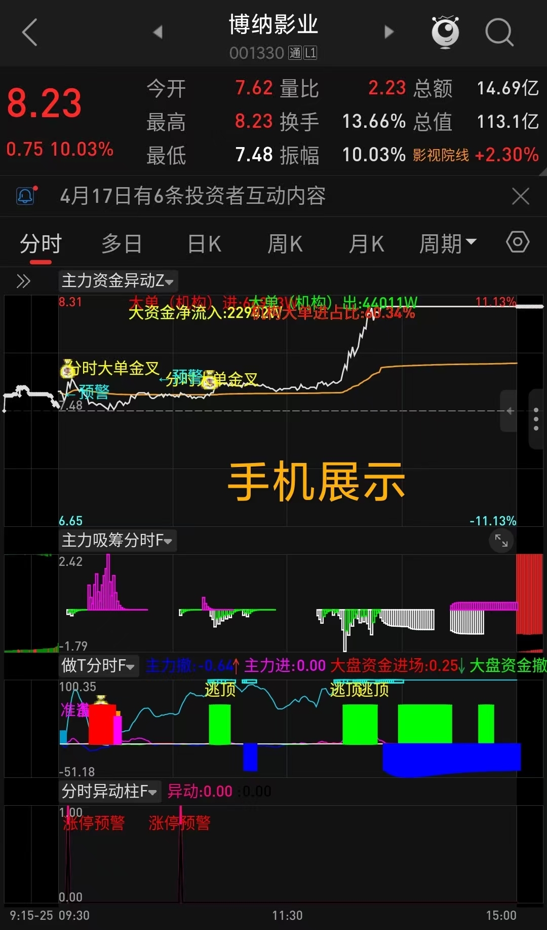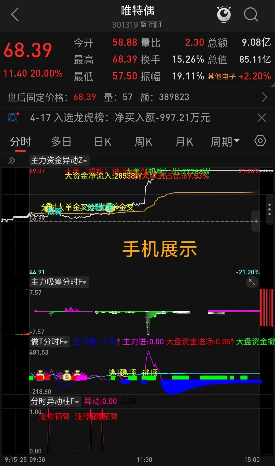 通达信【主力资金异动】分时指标,识别机构大单与金叉,监测主力资金动向,捕捉资金异动柱,T+0 抓涨停,手机电脑通用。