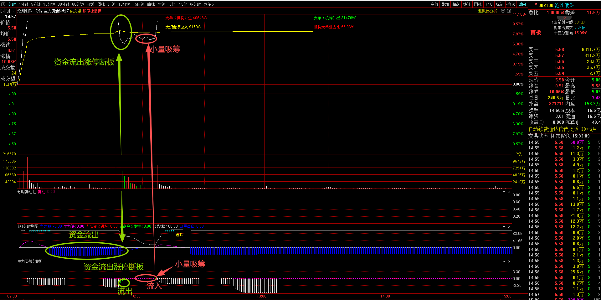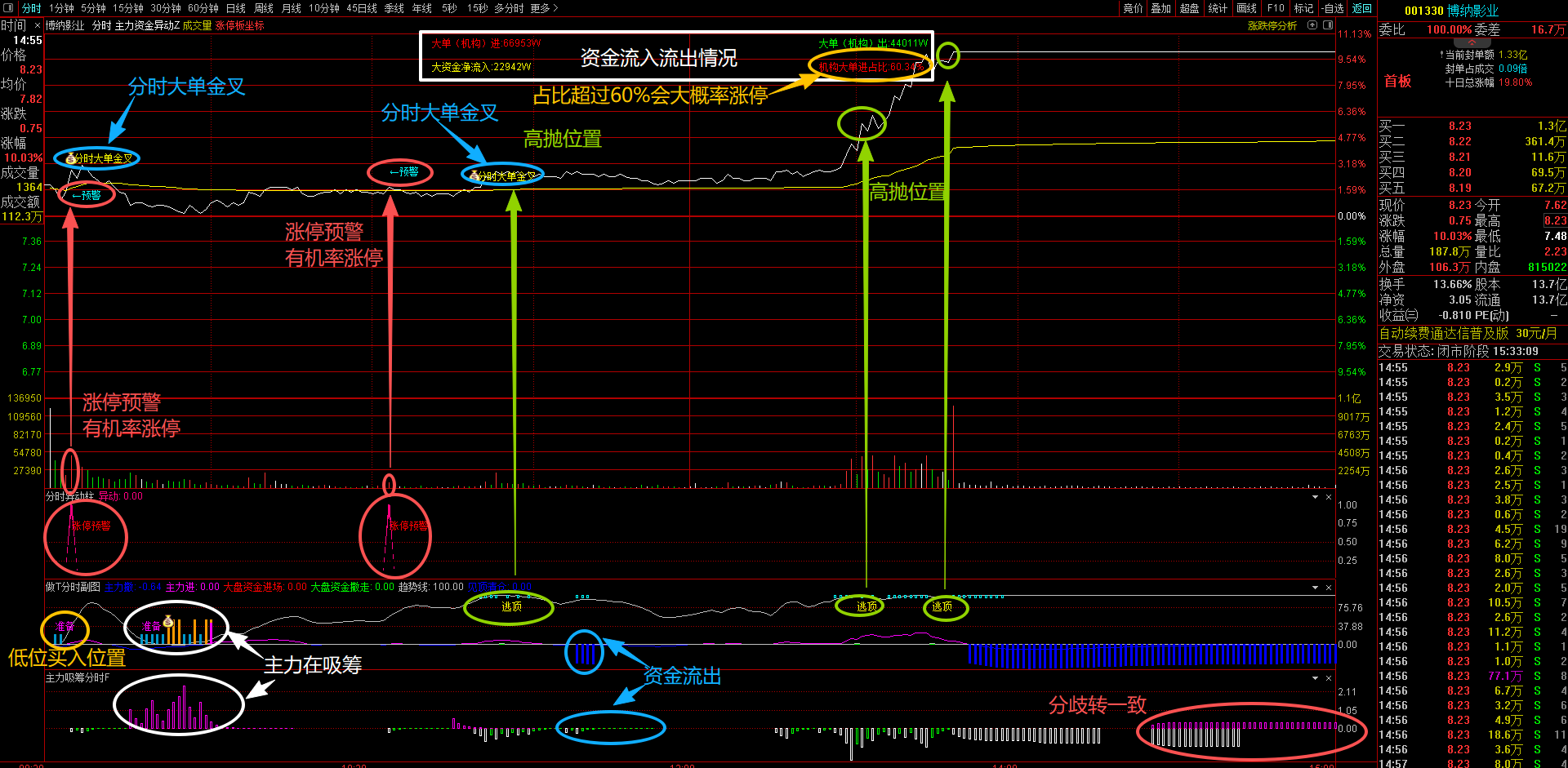 分时主图中显示大单资金进出情况数据,方便使用者辅助判断,当图中出现 钱袋子+单比分时大单金叉,机构大单进占比大于50%,当日涨停概率较大;