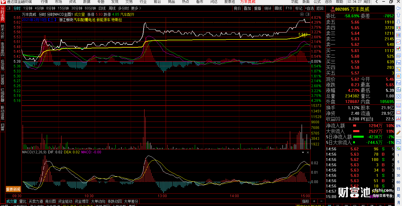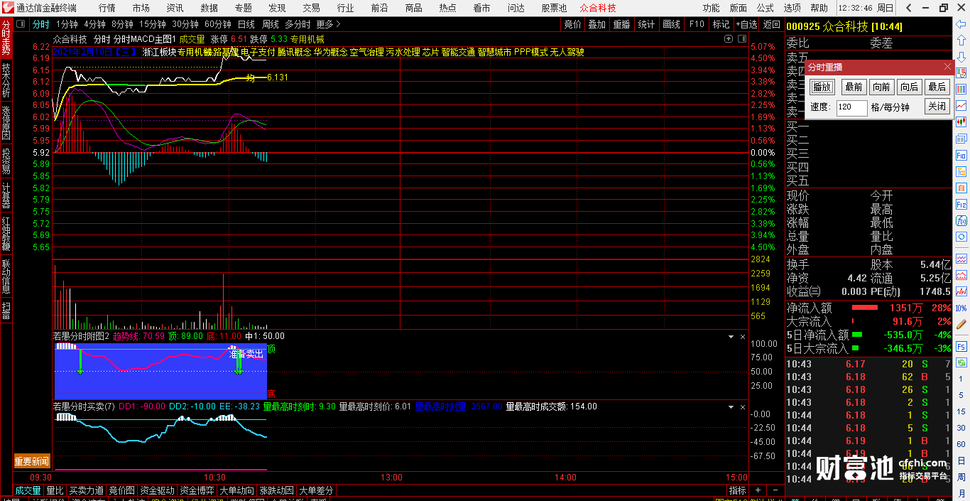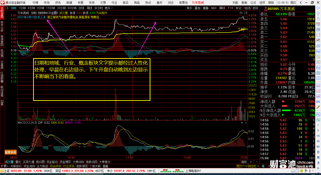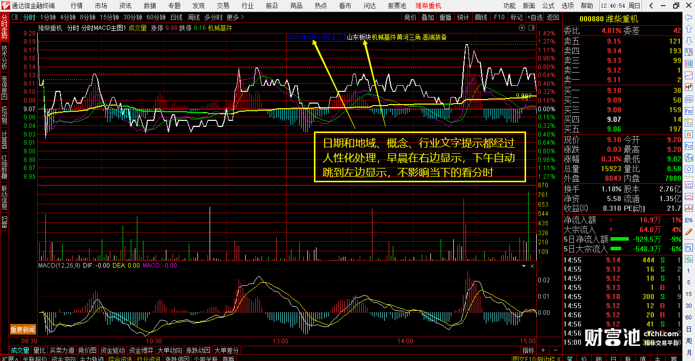 分时macd主图一是最单纯的macd分时主图,只是把macd添加进主图,另外添加了日期和星期,地域、行业、板块等概念。我的指标所有文字提示都经过人性化处理,既美观又不影响看当下的分时图,早晨文字提示在右边,下午自动跳到左边。