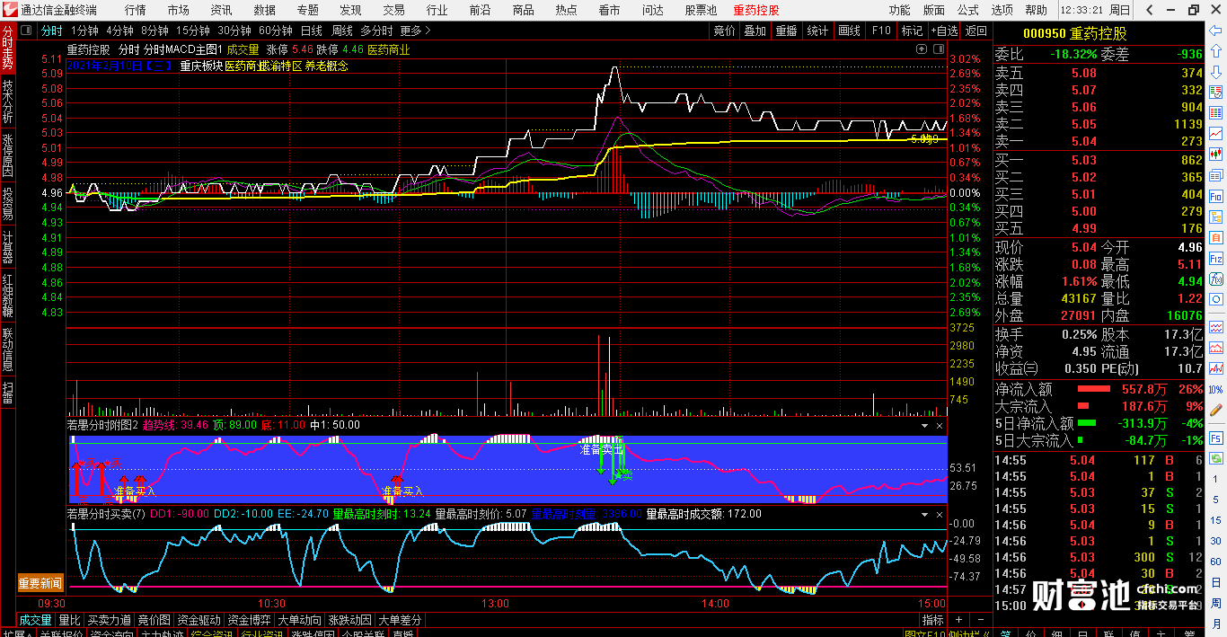 说明:用分时macd主图看盘绝对是非常实用,因为macd在分时是最小级别,顶背、底背非常管用,顶背处不管是一次、两次、三次。每次顶背都会回调一下。底背也是这样。这样看盘你完全可以避免追高和卖在最低。如果你分时附图配上超卖超买类指标提示当下的高和低,分时盘中看盘高低点抓起来不会错到那里去,非常实用。
