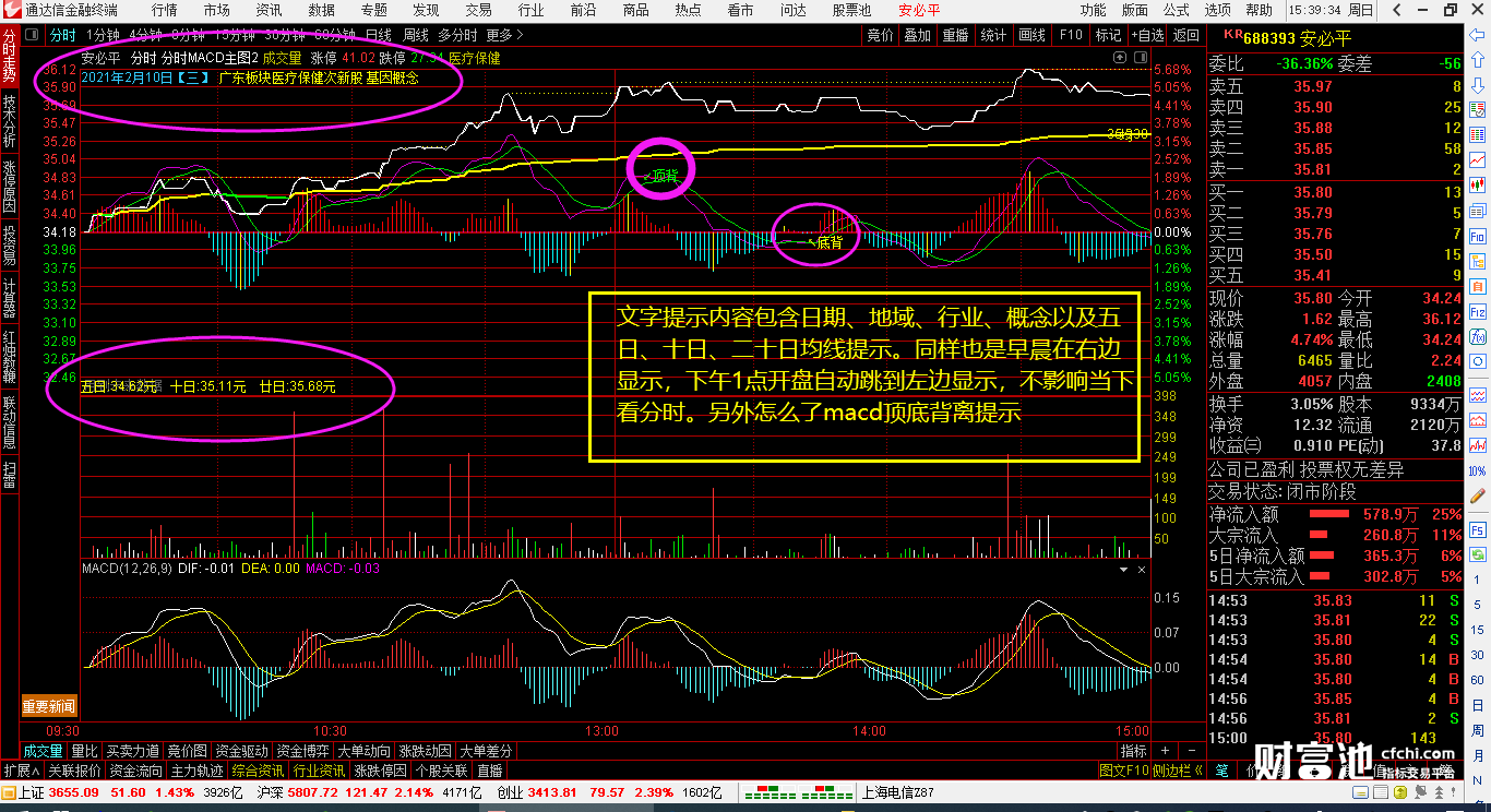 《分时macd主图二》:把macd添加进主图,另外添加了日期和星期,地域、行业、板块等概念文字提示。此类文字提示都经过人性化处理,早晨在分时主图的右侧显示,下午1点开盘自动跳到分时主图的左侧显示,不影响看当下的分时。实用美观大方又不凌乱,非常漂亮