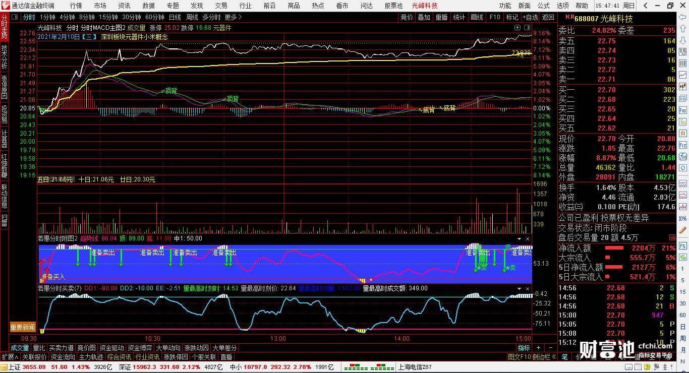 说明:分时macd主图(二)看盘绝对是非常实用,因为macd在分时是最小级别,顶背、底背非常管用,顶背处不管是一次、两次、三次。每次顶背都会回调一下。底背也是这样。这样看盘你完全可以避免追高和卖在最低。如果你分时附图配上超卖超买类指标提示当下的高和低,再结合分时主图macd的顶底背离、红绿柱的最高最低特殊颜色(黄色)提示,看盘高低点抓起来不会错到那里去,非常实用。