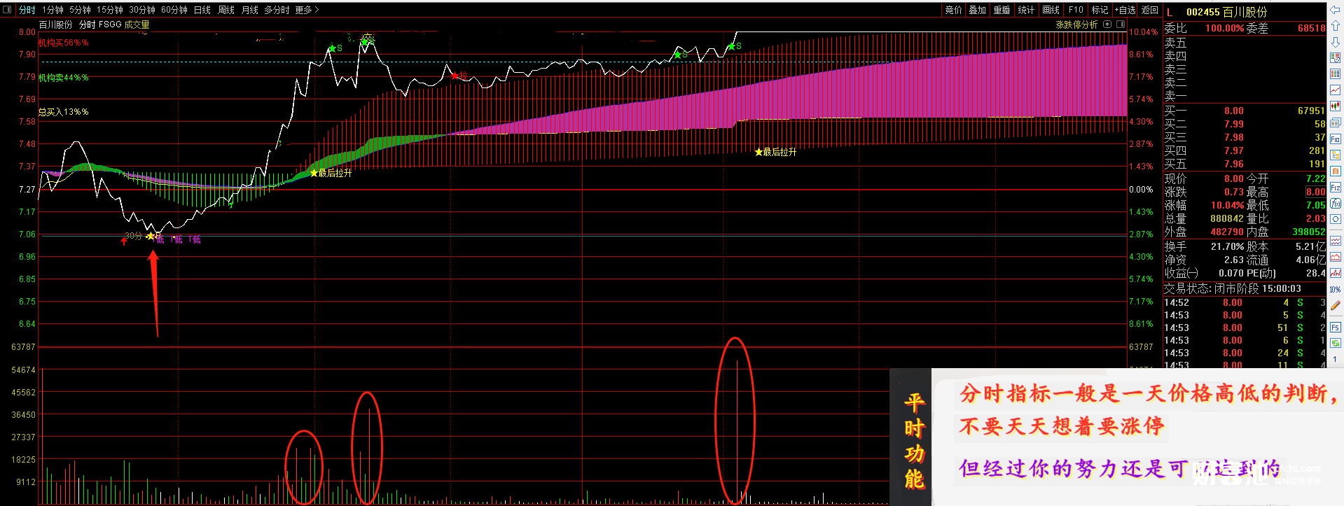 分时系统一般是为判断一天中的价格高低,适时高抛低吸的工具,分时拉板诀窍是分时指标最难诀窍,为达到最高境界,必须努力实践,实盘跟踪学习。因人而异。