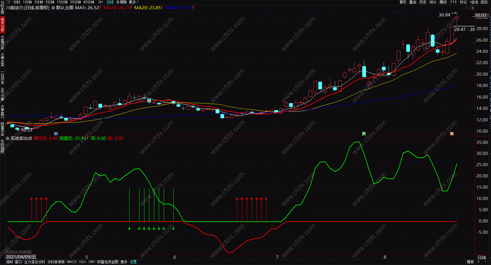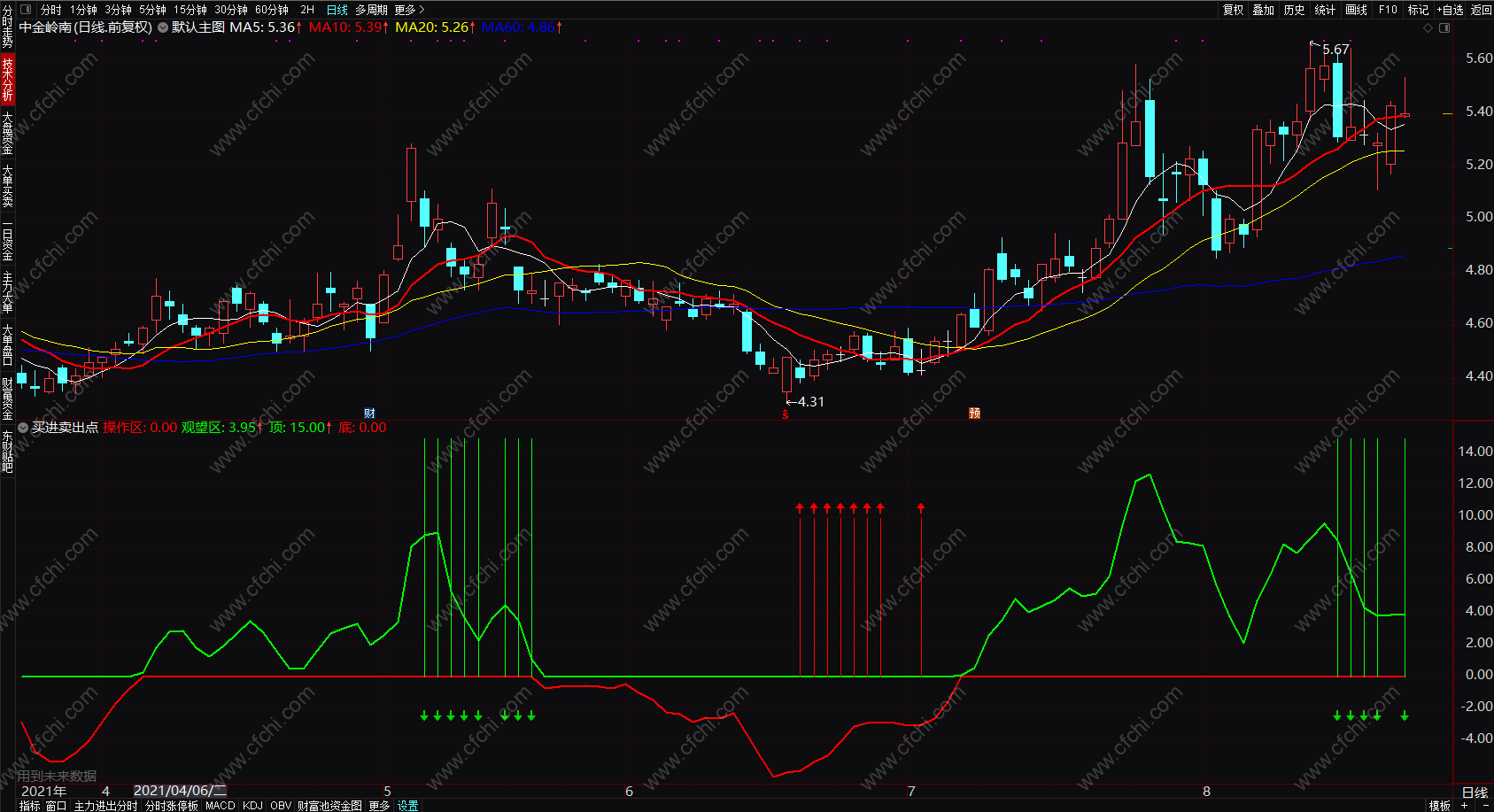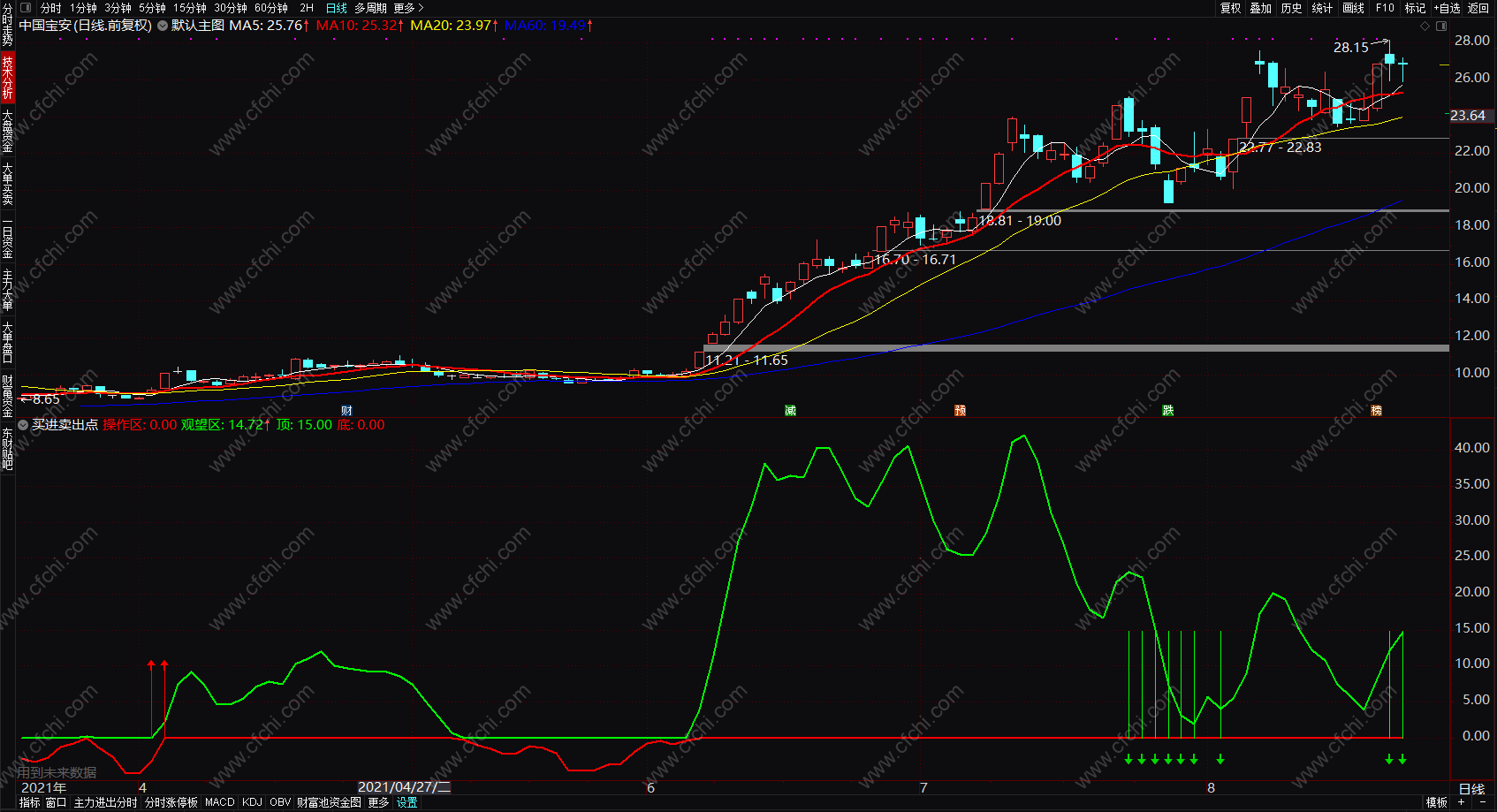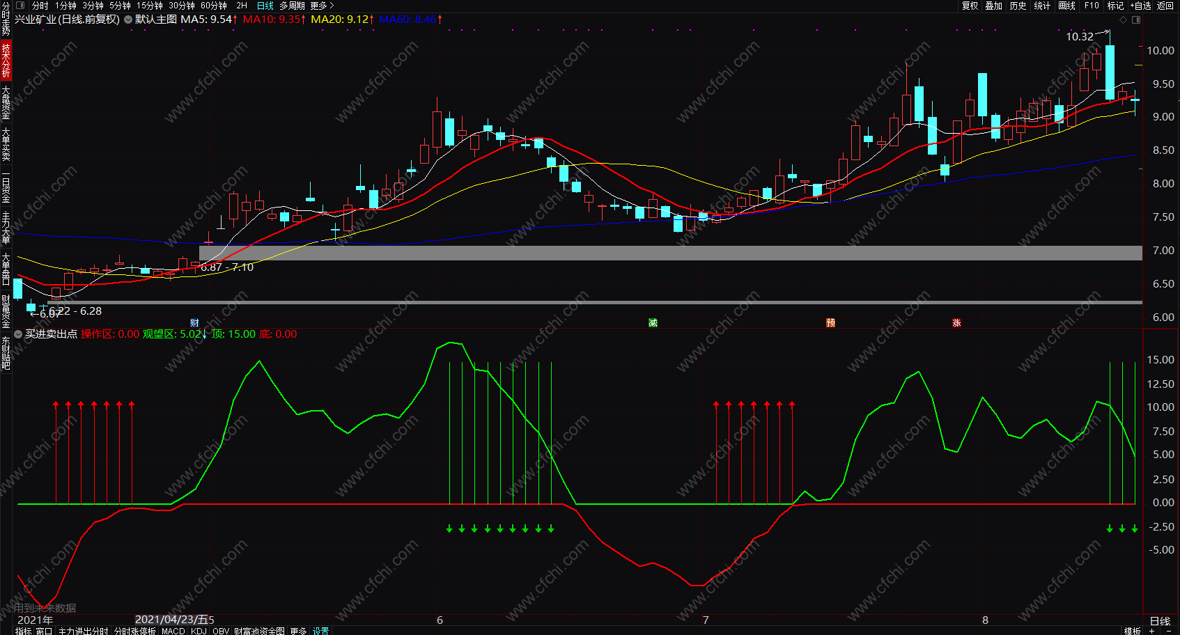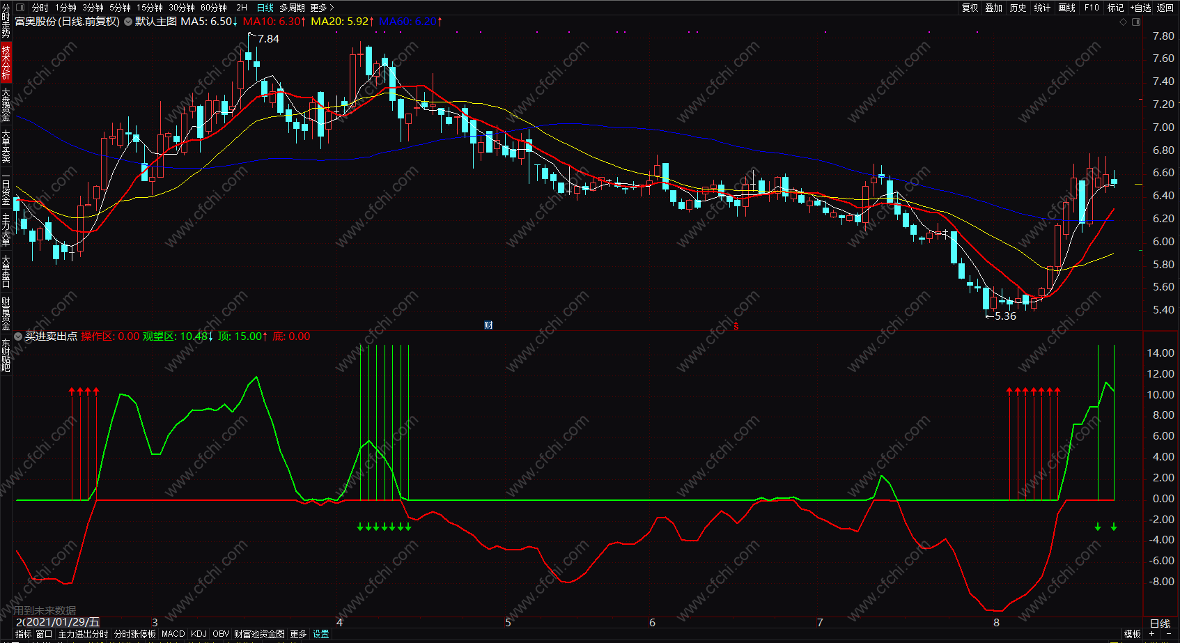 补充:当有第一个红色箭头提示时买入;第一个绿色箭头出现时卖出。买入后,如果操作区线呈现上升趋势,则持股,如果观望区线调头向下(不一定等到绿色箭头出现,绿色箭头出现已经是阶段最后卖出提示)则卖出。