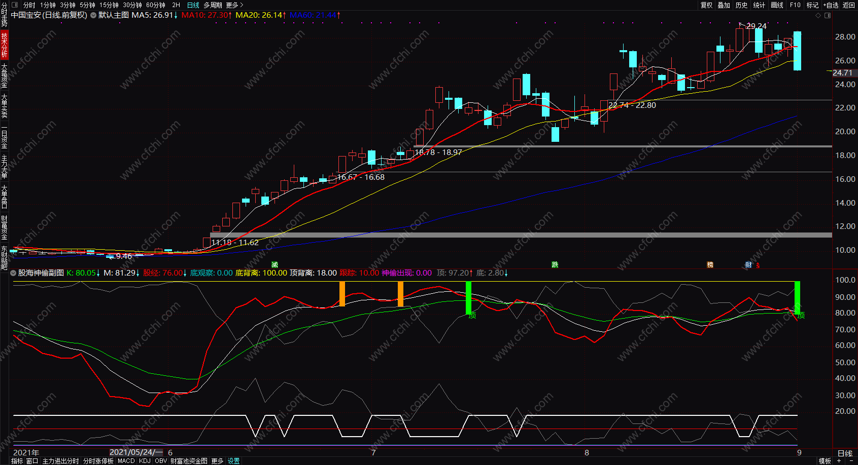 顶背离: IF((VAR26>90),5,18), COLORFFFFFF,LINETHICK2;