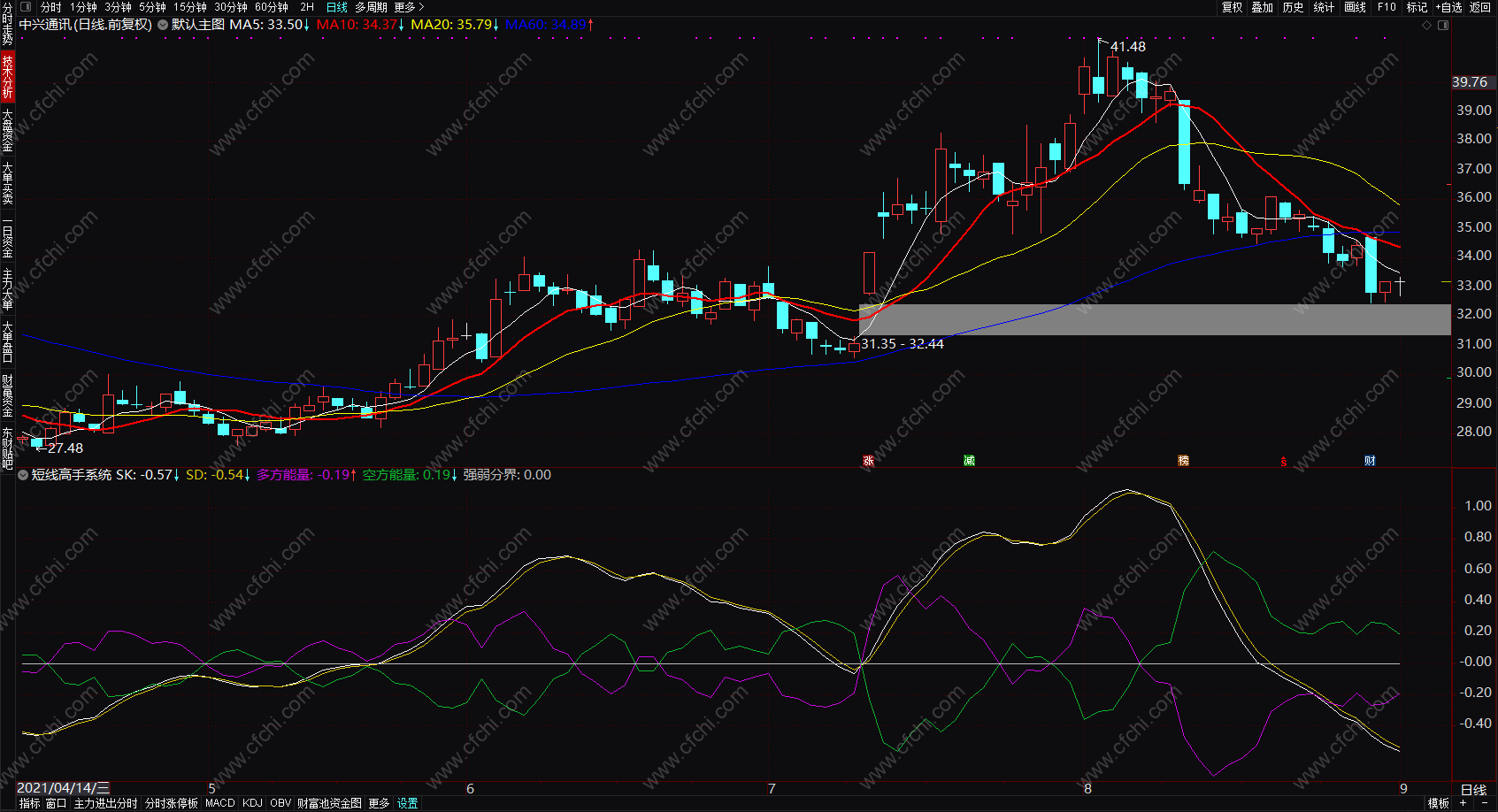 2、卖点:当"空方能量"绿线上翘、"多方能量"紫线下勾时卖出;当"空方能量"绿线向上与"多方能量"紫线"金叉"或SK与SD死叉时为止损的卖点。