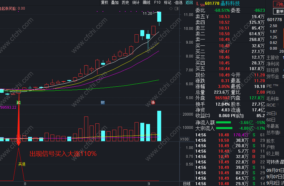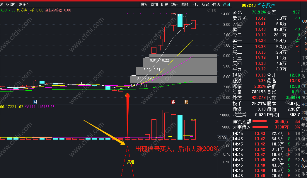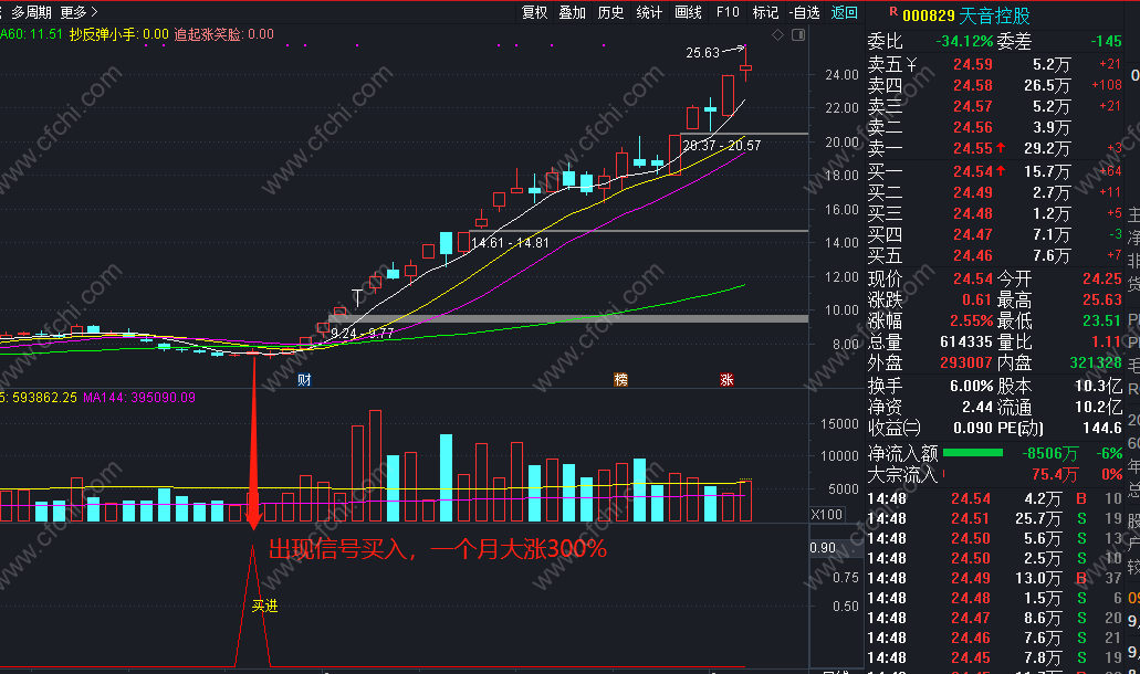 案例一:出现买入信号之后,连续3个一字涨停,后续4天也是连续大涨,总体短时间上涨200%
