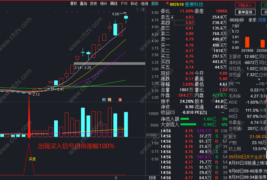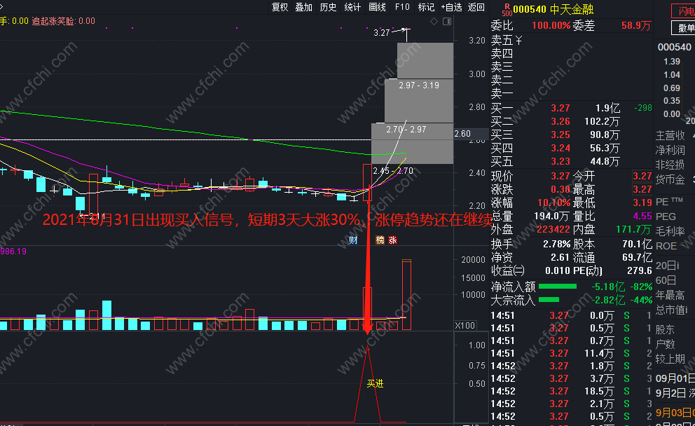 案例三:2021年8月31日出现买入信号,目前已经是4个涨停,上涨还在继续,后市拭目以待,这样的牛股指标,一个足矣!