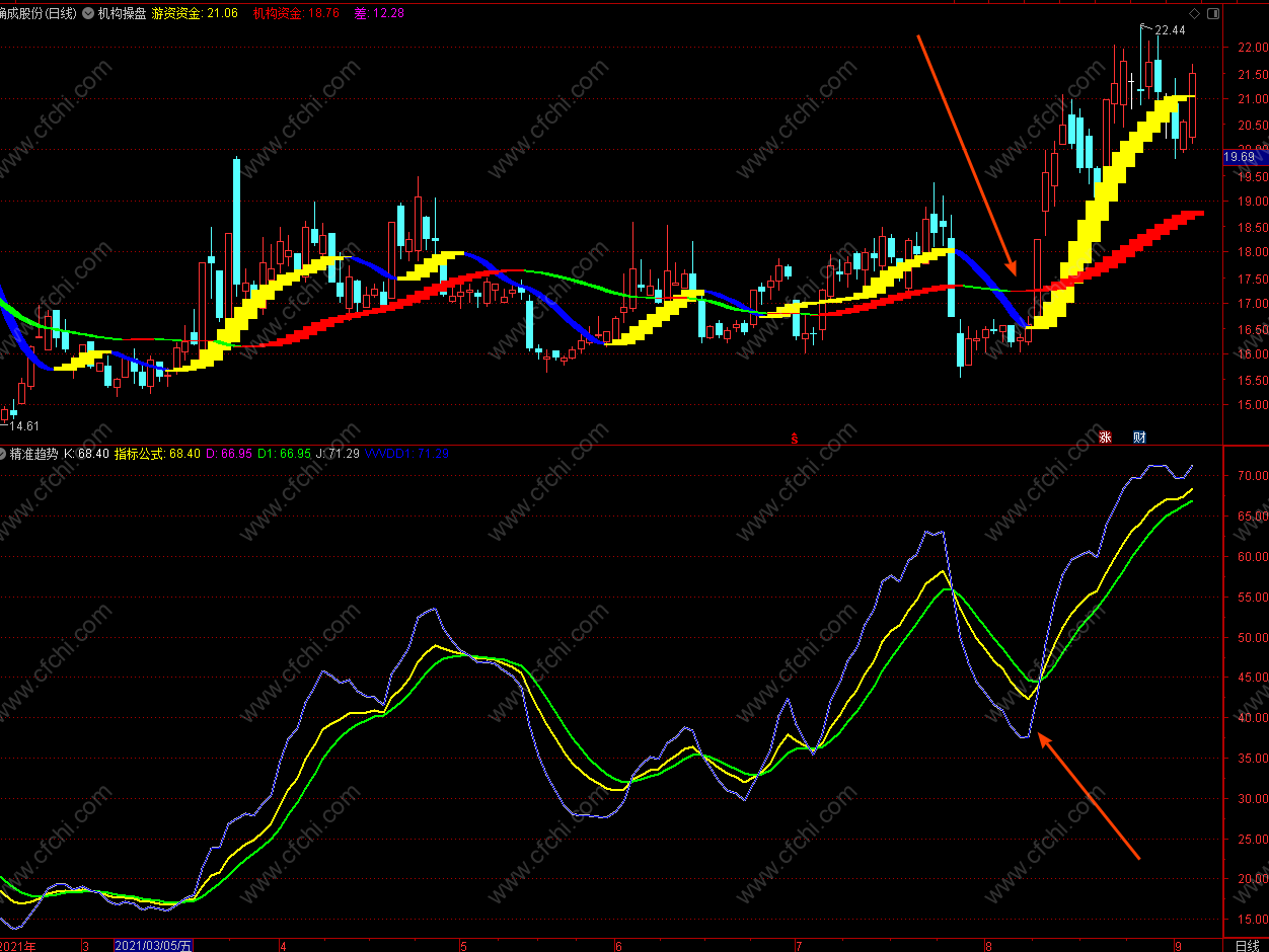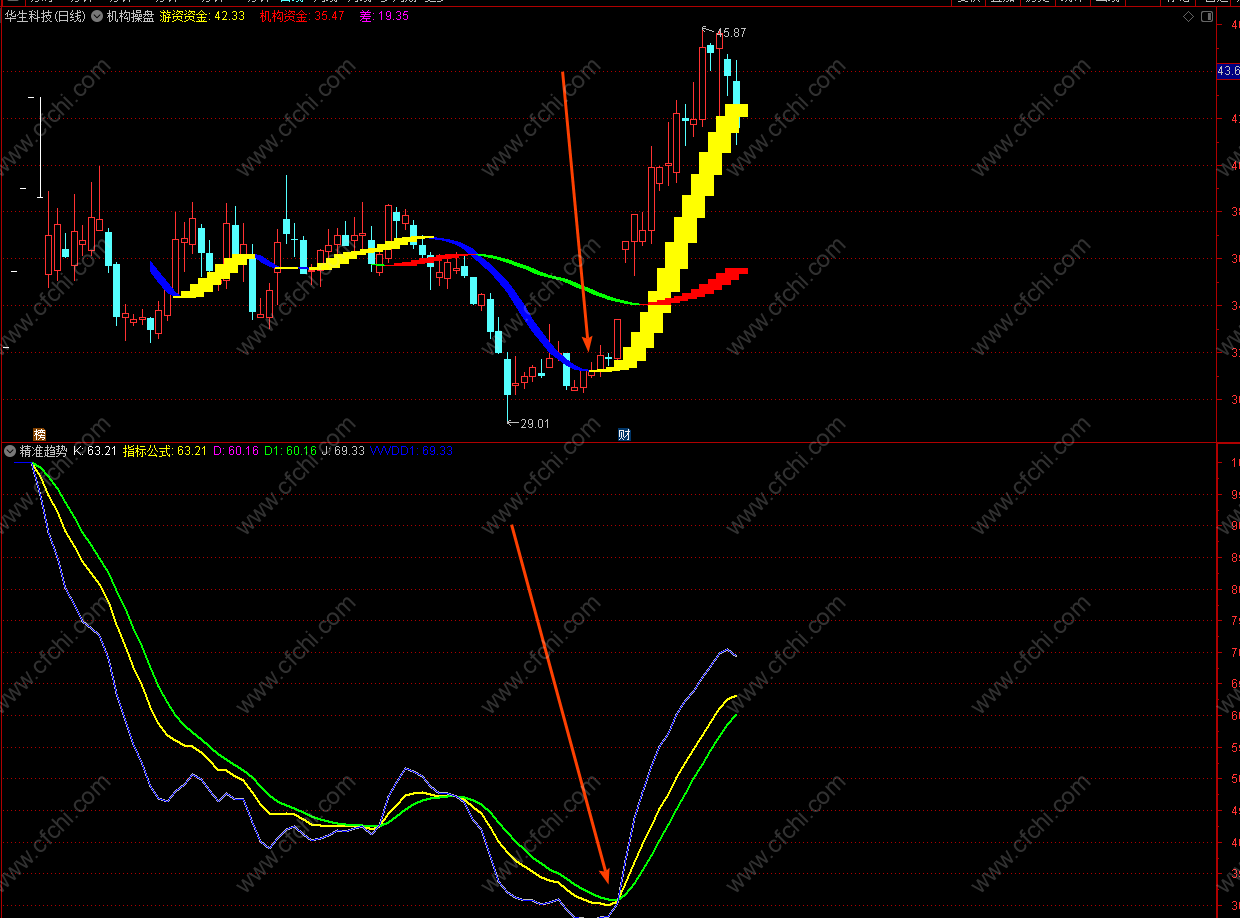 备注:案例中所用的主力资金指标需要额外获取,不在本精准趋势幅图指标内。下载地址: