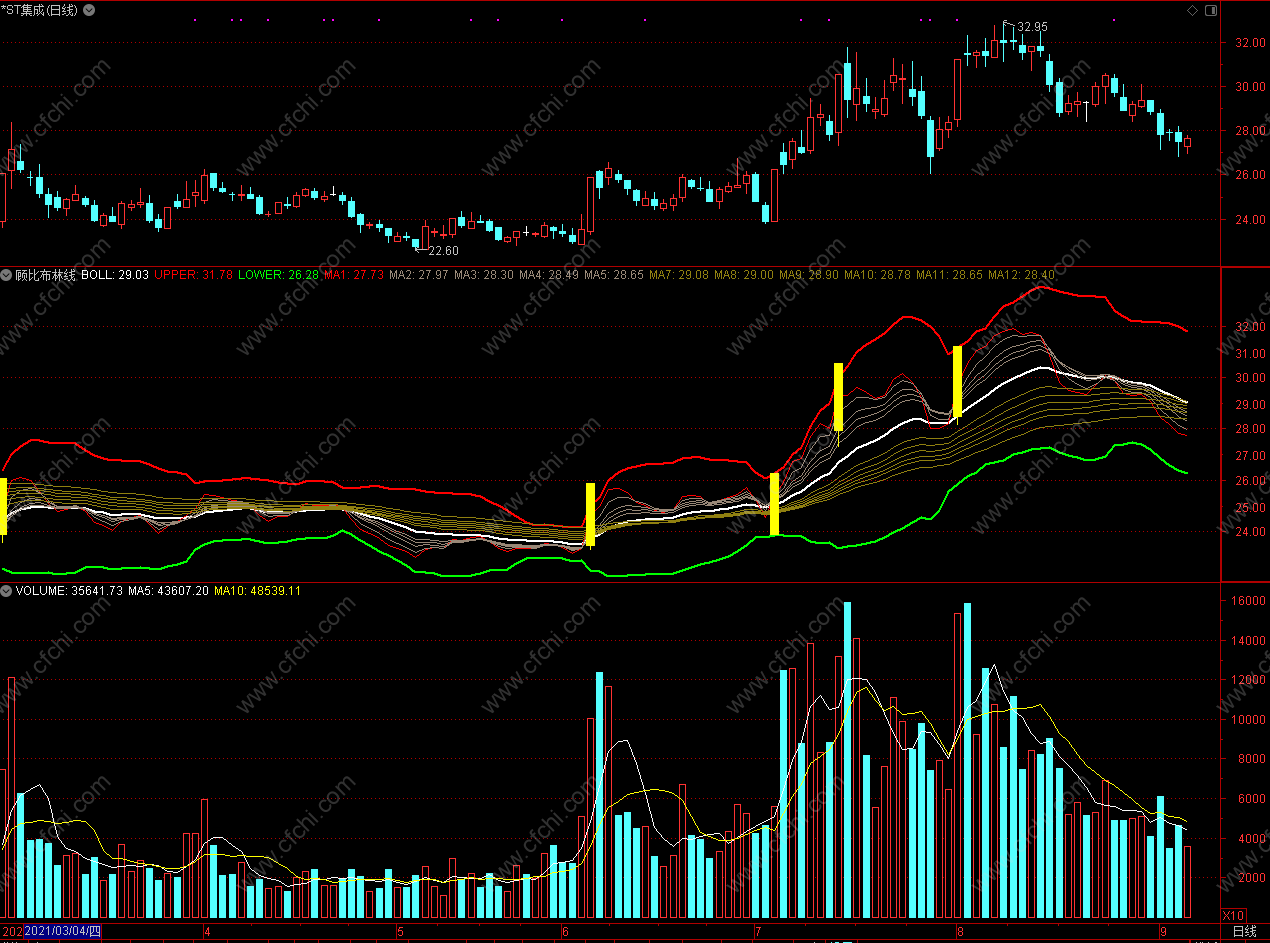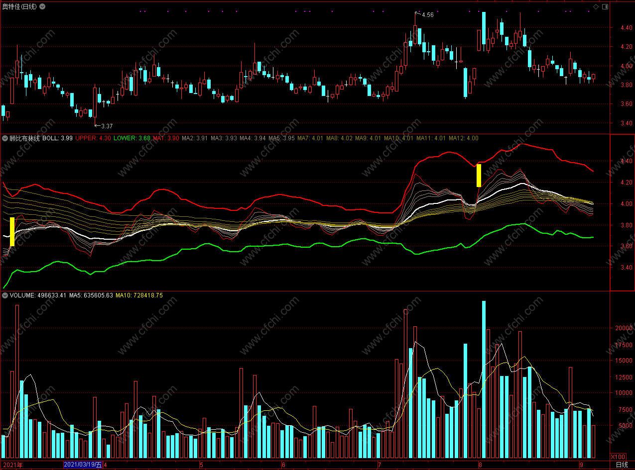lower:BOLL-2*STD(CLOSE,20),colorgreen,linethick2;