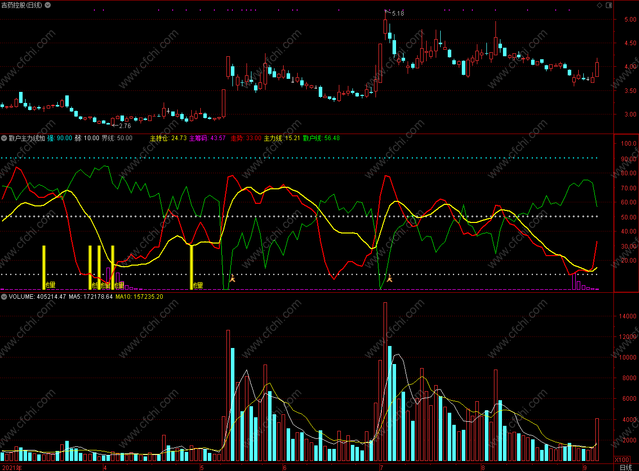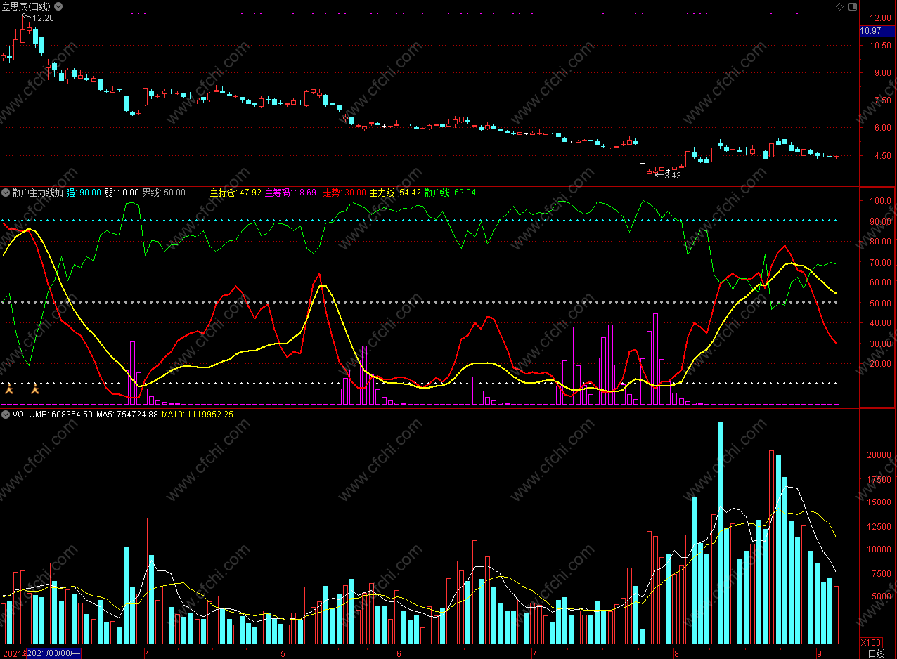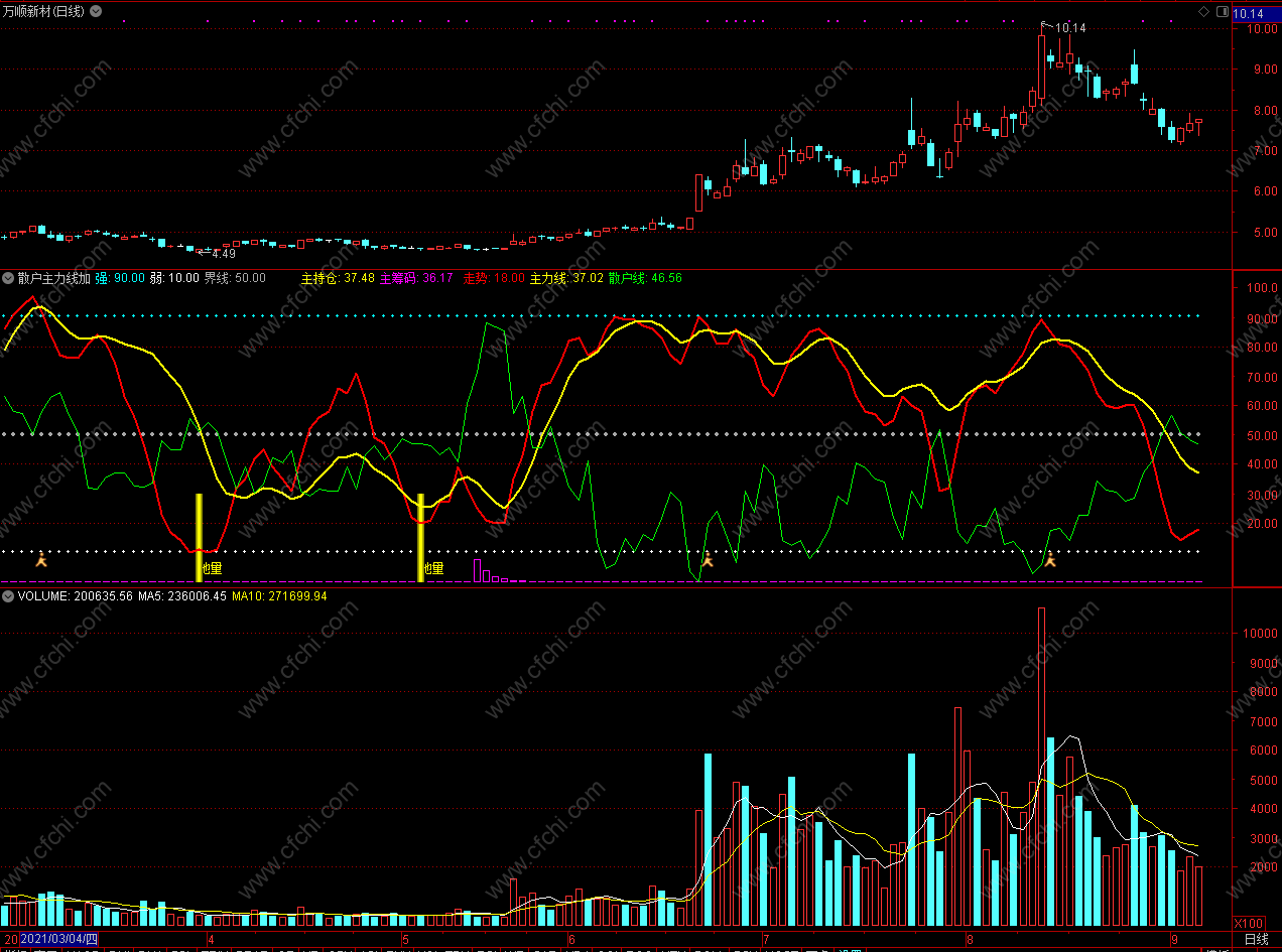 该指标分析股价的强弱走势,揭示散户主力的力量对比。散户线穿越主力线是是买入信号,反之是卖出信号。
