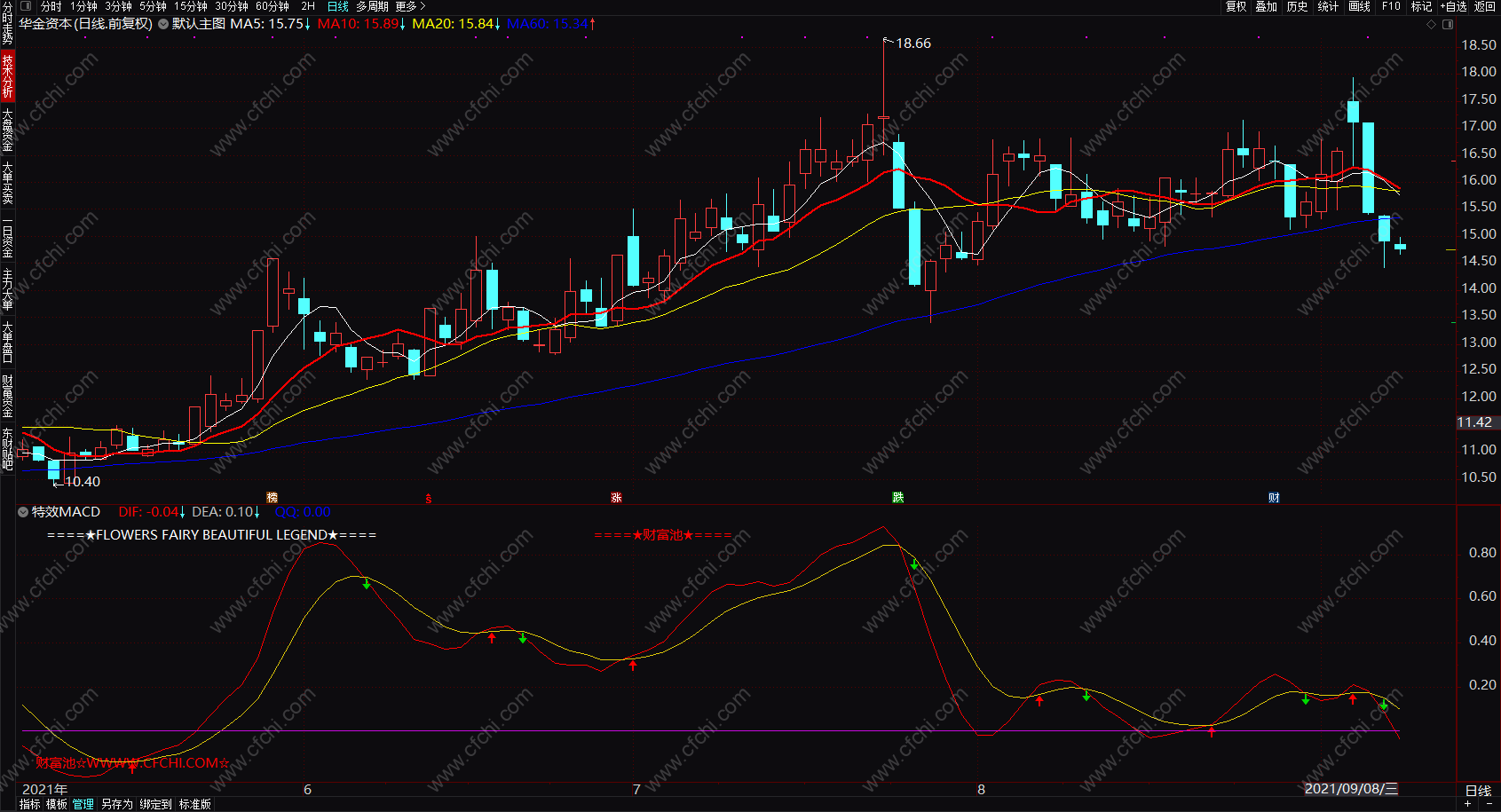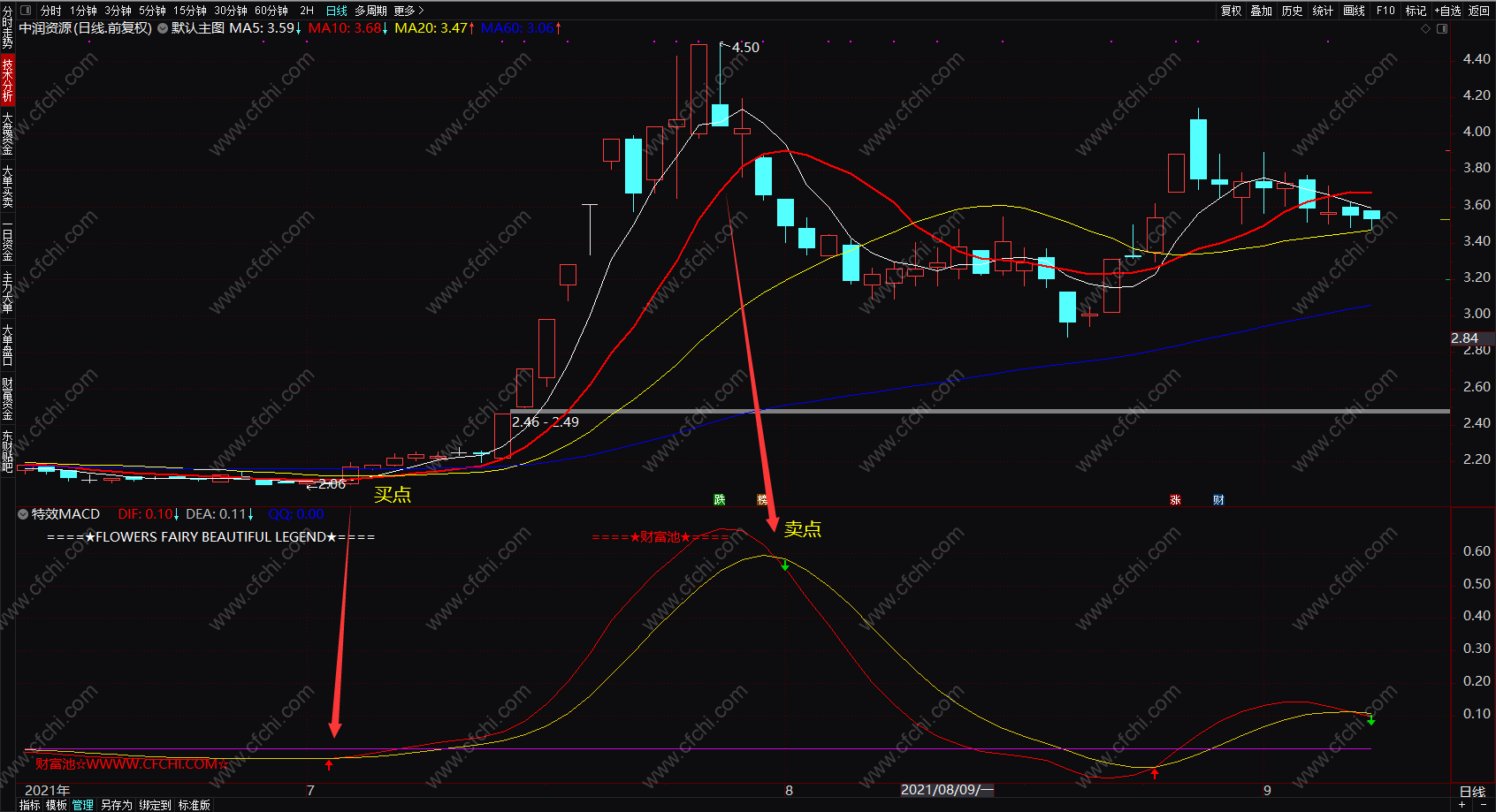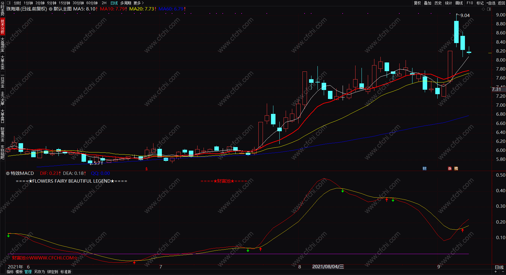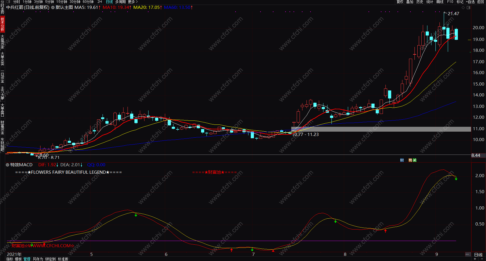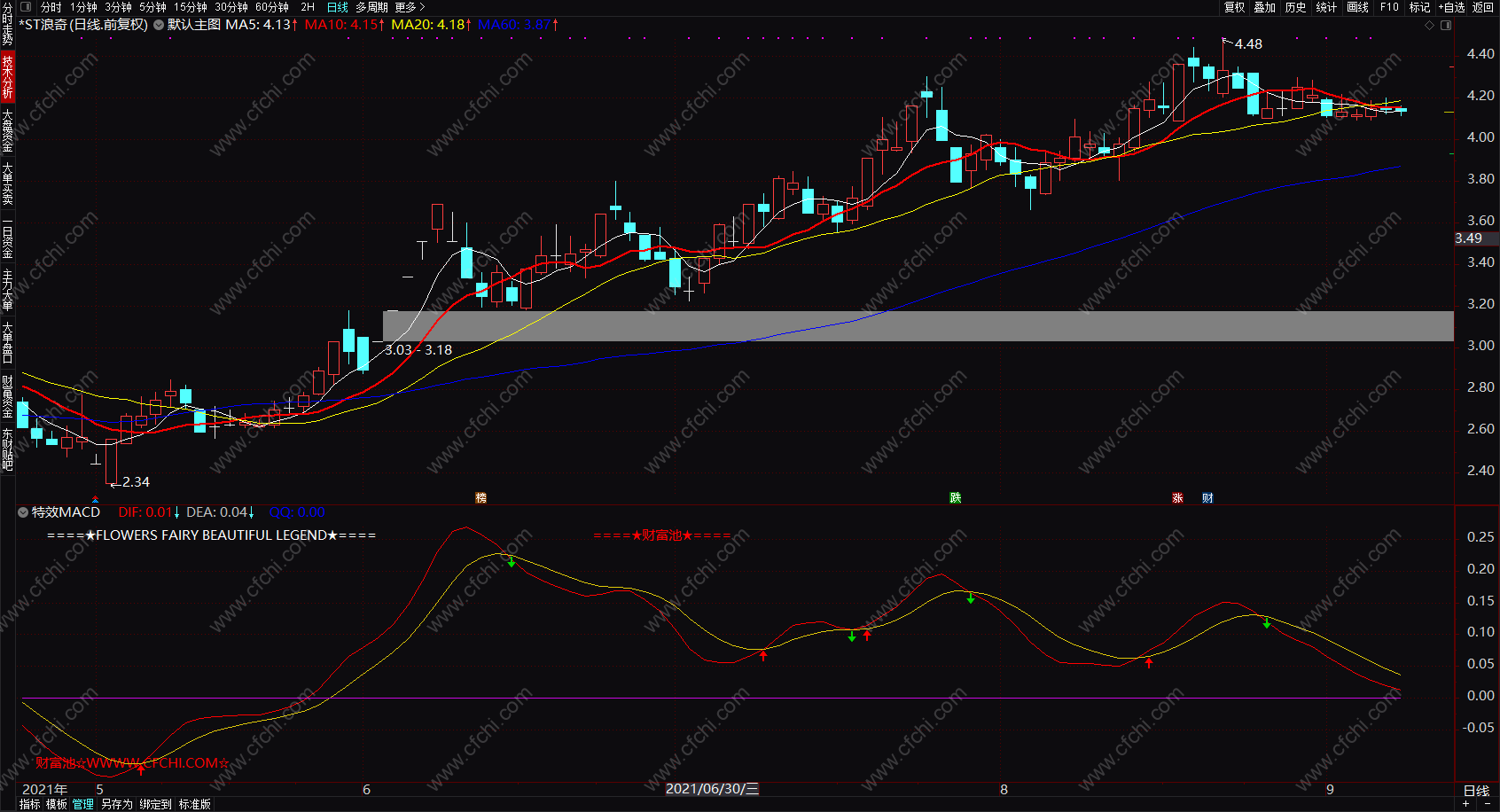 DRAWTEXT_FIX(C>O,0.01,0.9,0,' 财富池☆WWWW.CFCHI.COM☆ '),COLORRED;