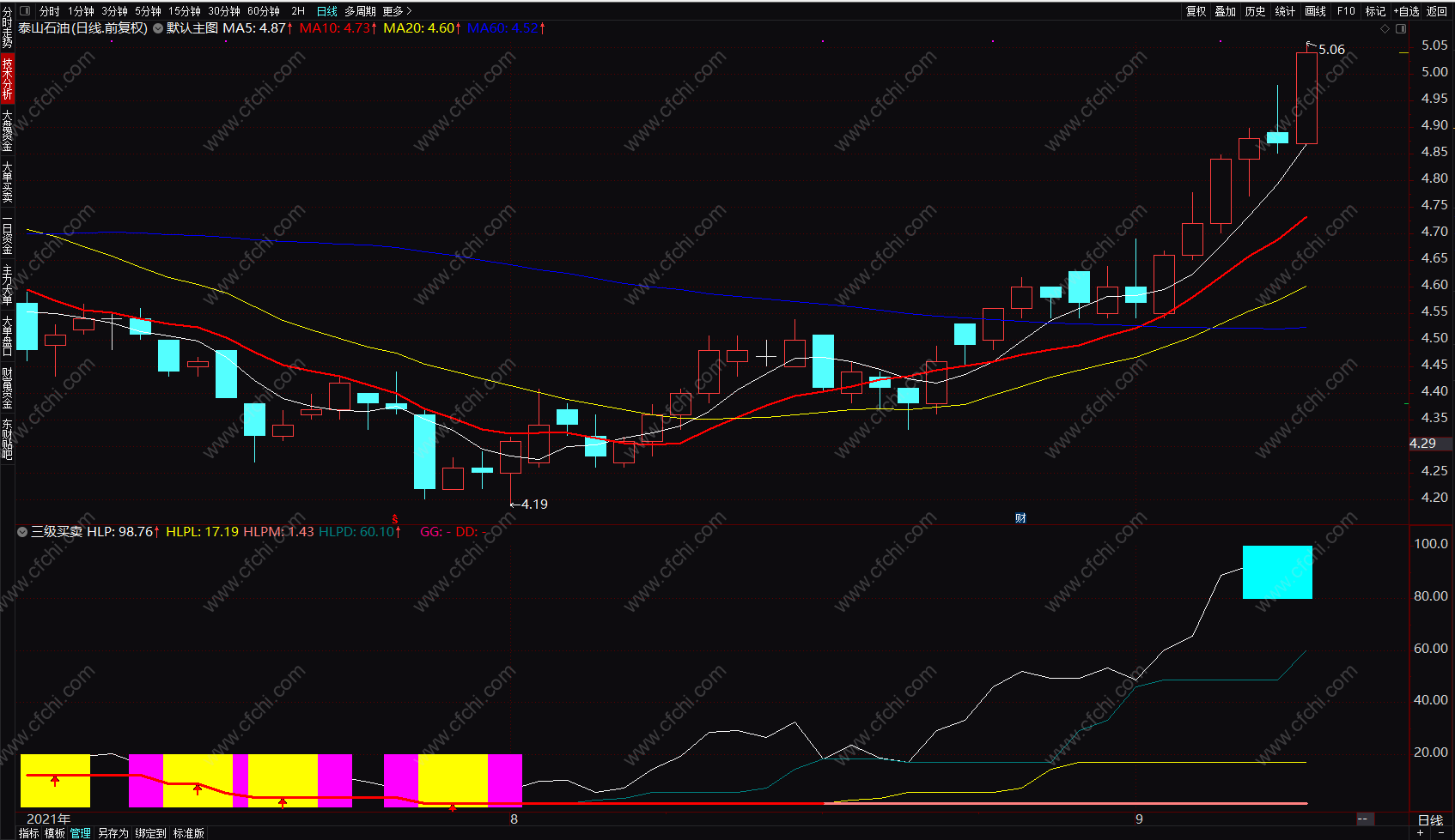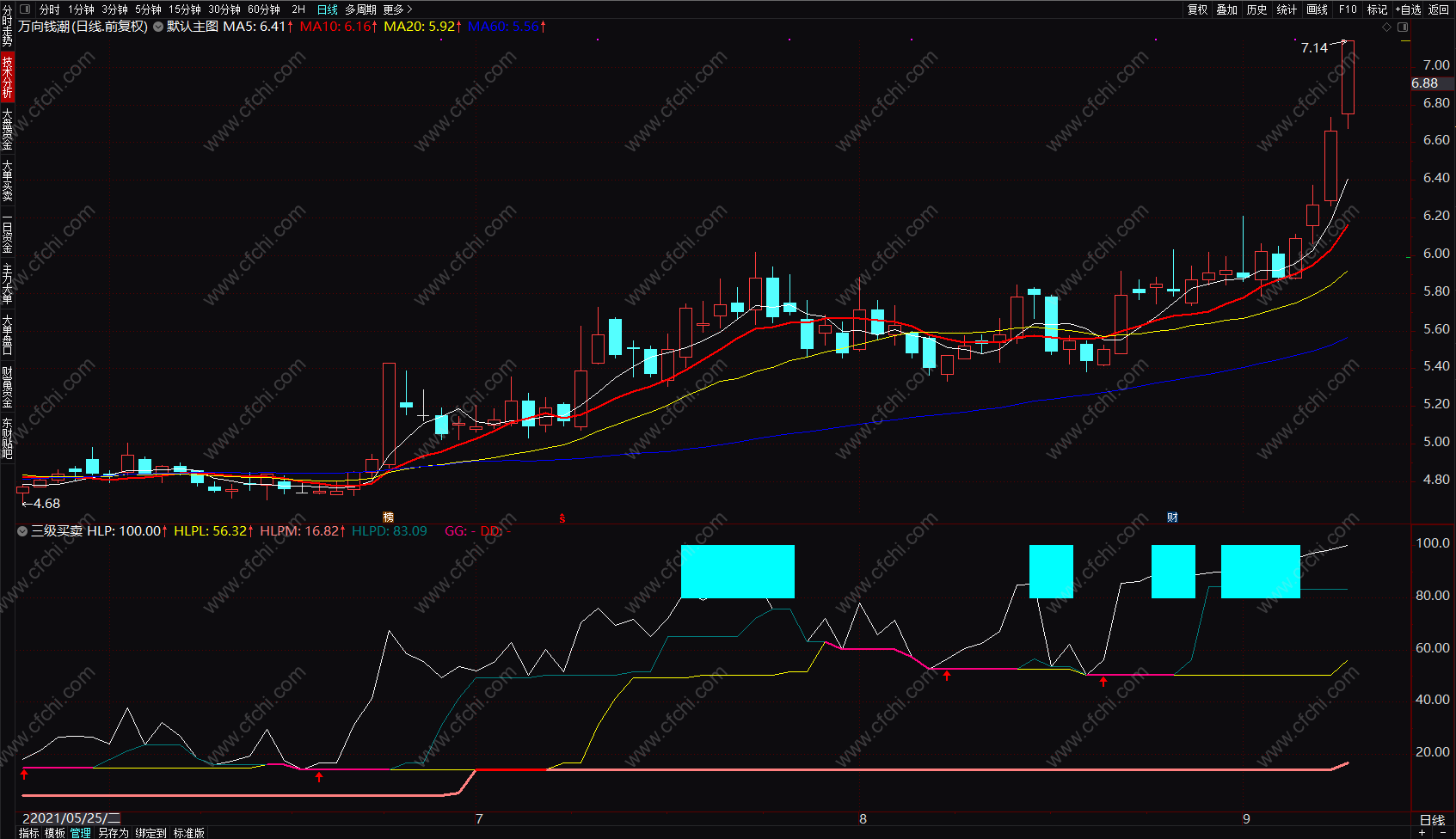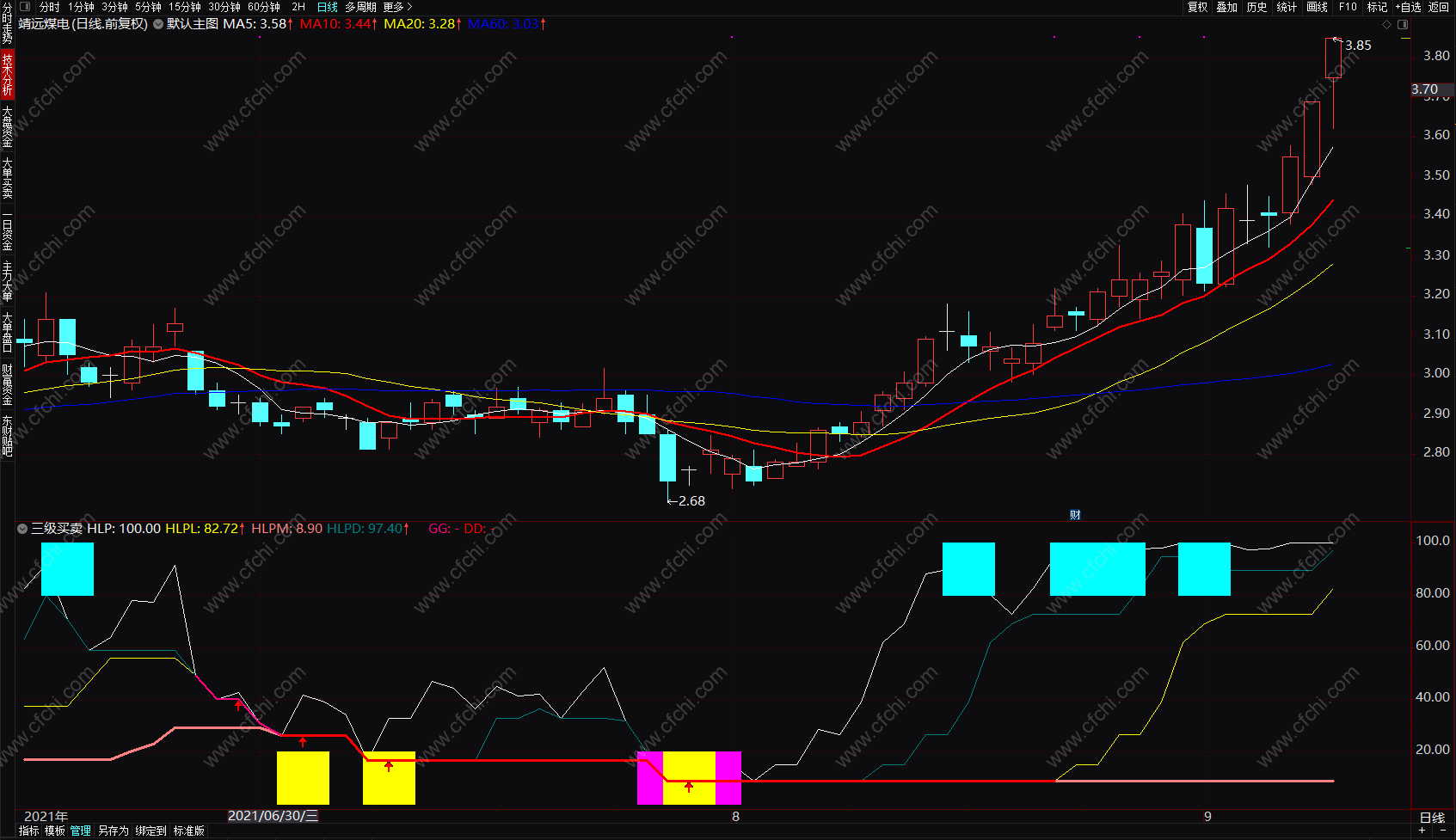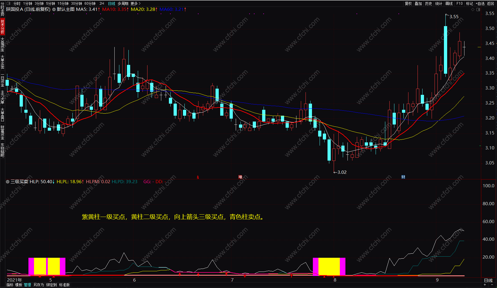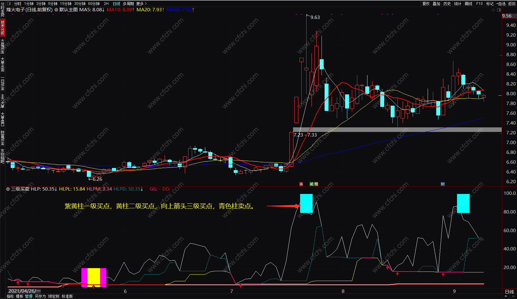 买卖点指标:紫黄柱一级买点,黄柱二级买点,向上箭头三级买点,青色柱卖点。