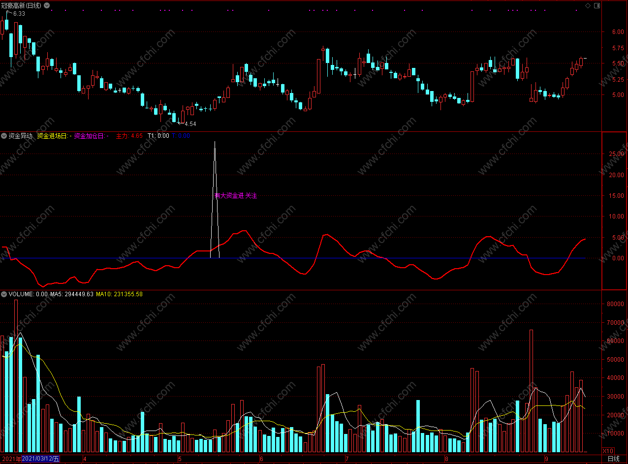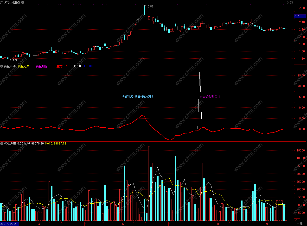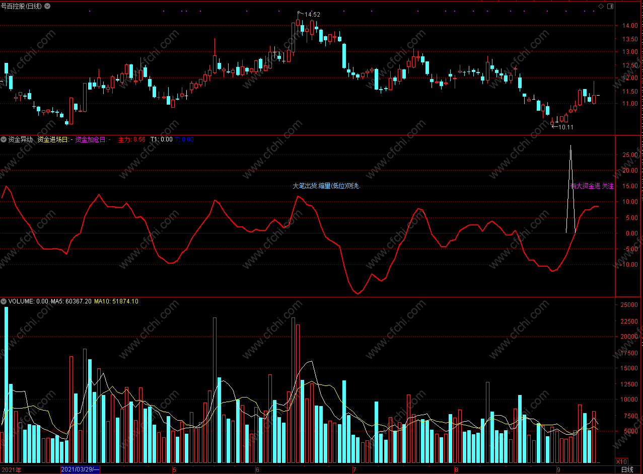 指标用法:提示大笔出货时是卖出信号,提示资金进场时是买入信号。