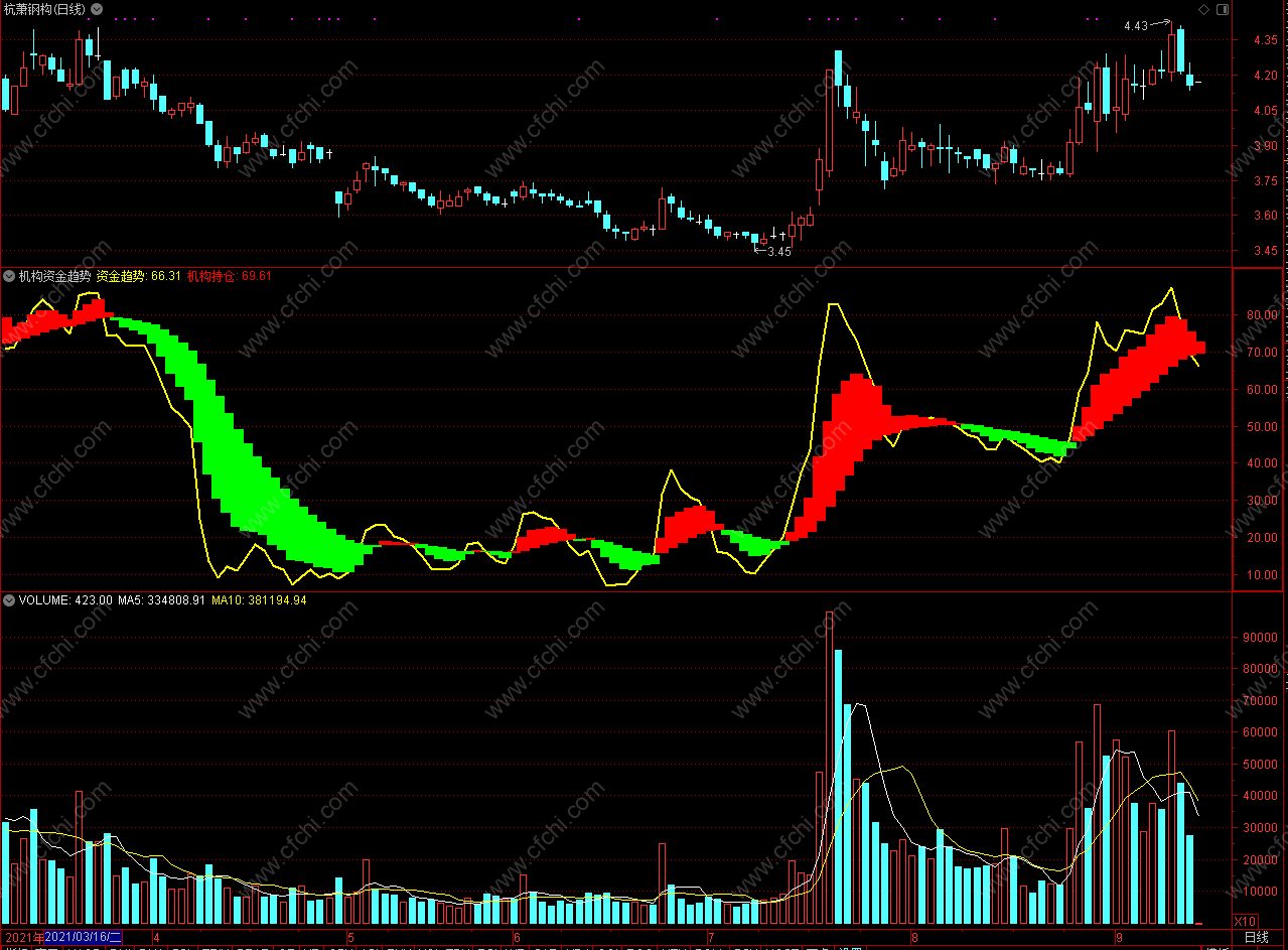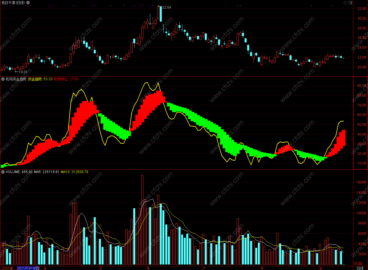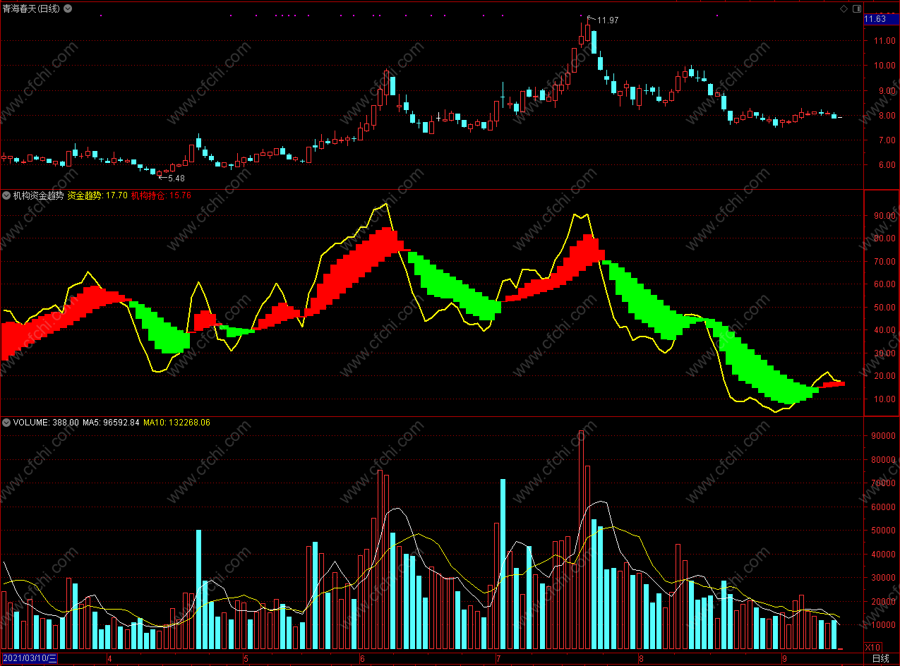 黄色曲线代表个股中机构资金作多与做空的趋势和力度,向上为买入趋势,向下为卖出趋势,另一部分由红绿柱状线组成,代表机构持仓与增减仓的状态.黄色资金趋势向下未跌破柱状的机构持仓线时为机构短线洗盘,黄色机构资金趋势线向下跌破机构持仓线,并使持仓线翻绿,表示机构大力卖出,为不宜操作区域。