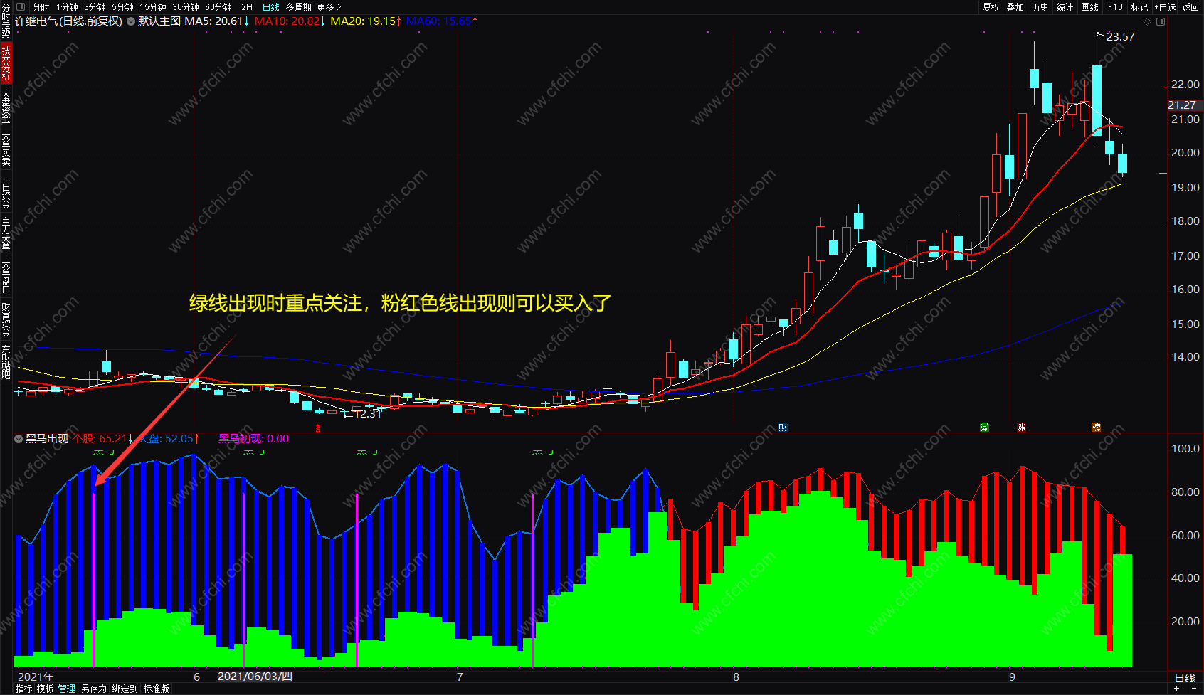 绿线出现时重点关注,粉红色线出现则可以买入了。
