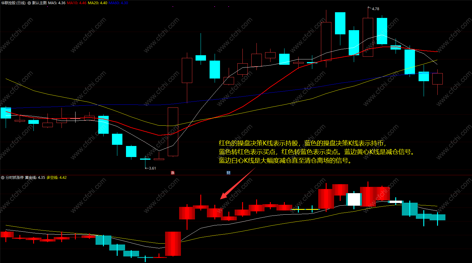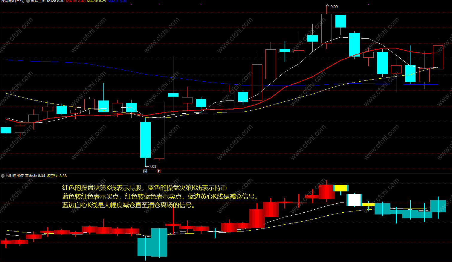 红色的操盘决策K线表示持股,蓝色的操盘决策K线表示持币,蓝色转红色表示买点,红色转蓝色表示卖点。蓝边黄心K线是减仓信号。蓝边白心K线是大幅度减仓直至清仓离场的信号。