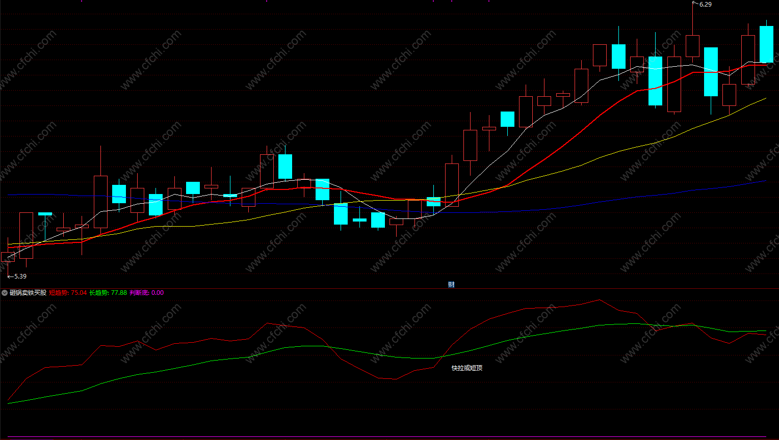 DRAWTEXT(CROSS(短趋势,长趋势)AND 长趋势>25 AND 长趋势>REF(长趋势,1),50,'快拉或短顶');