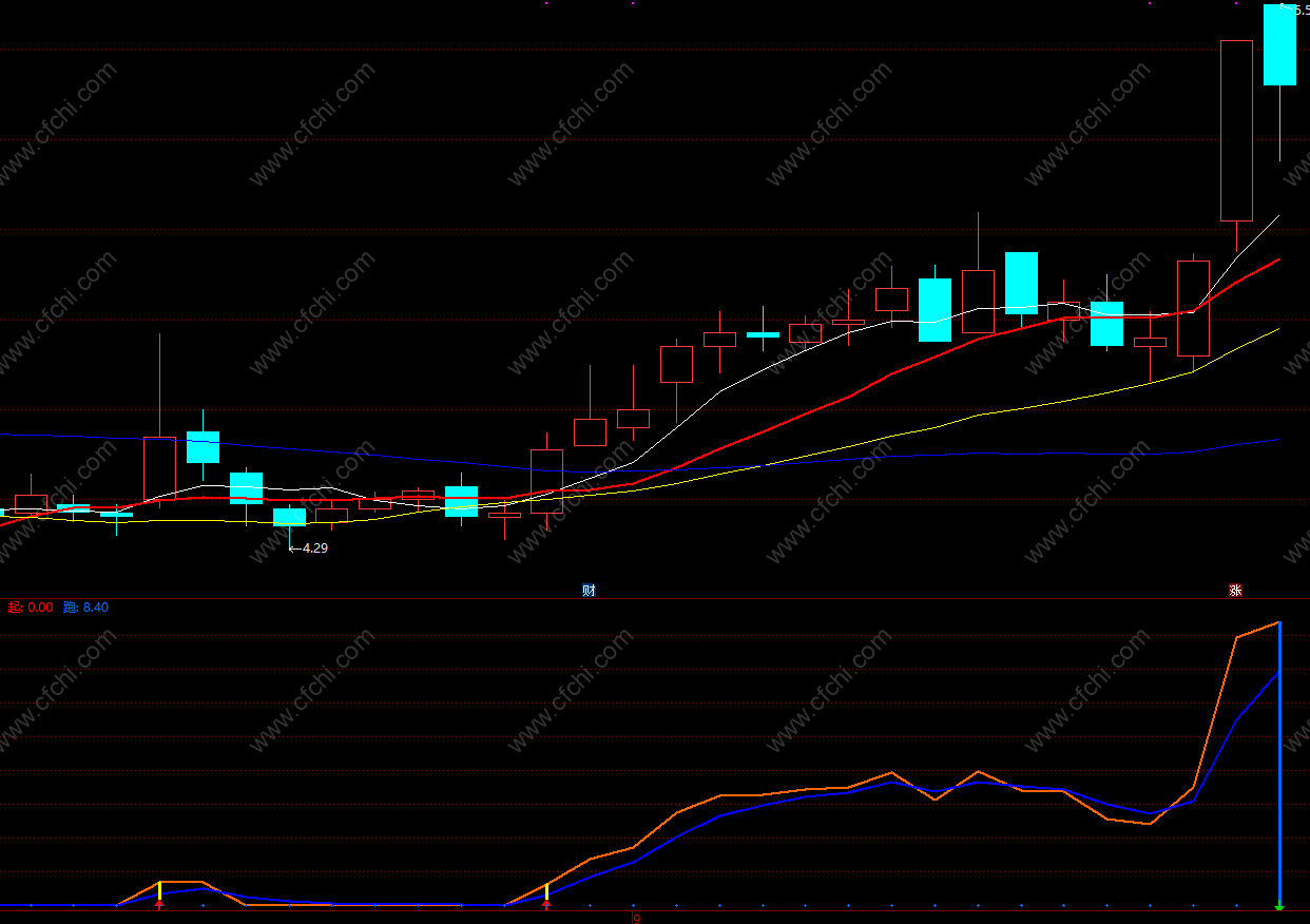 橙线和蓝线有走平后突然拉起为买入参考。长期下跌后出现的指标线拉升起来效果佳。