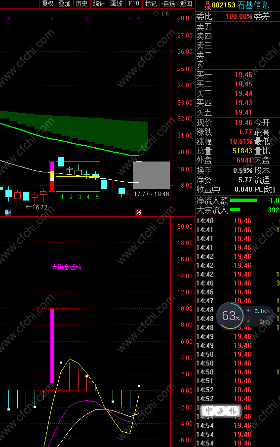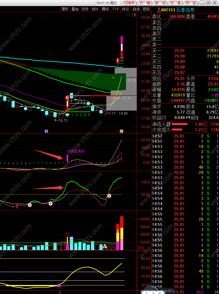 (大资金活动底部启动对倒。强势股票.热门题材股。分析指标KDJ趋势洗盘。继续大涨)