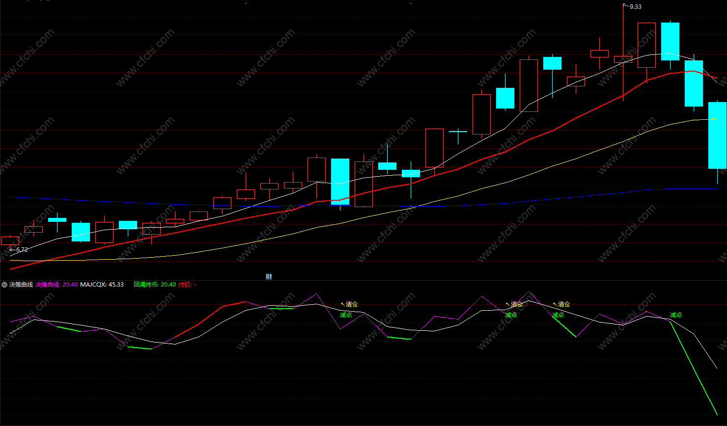 图中红色线段买入,绿色卖出,红玫色线段一起就是大底,“清仓”卖出信号强势!