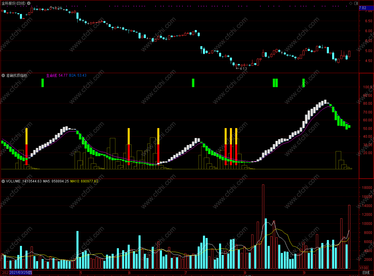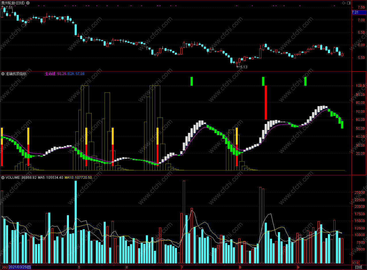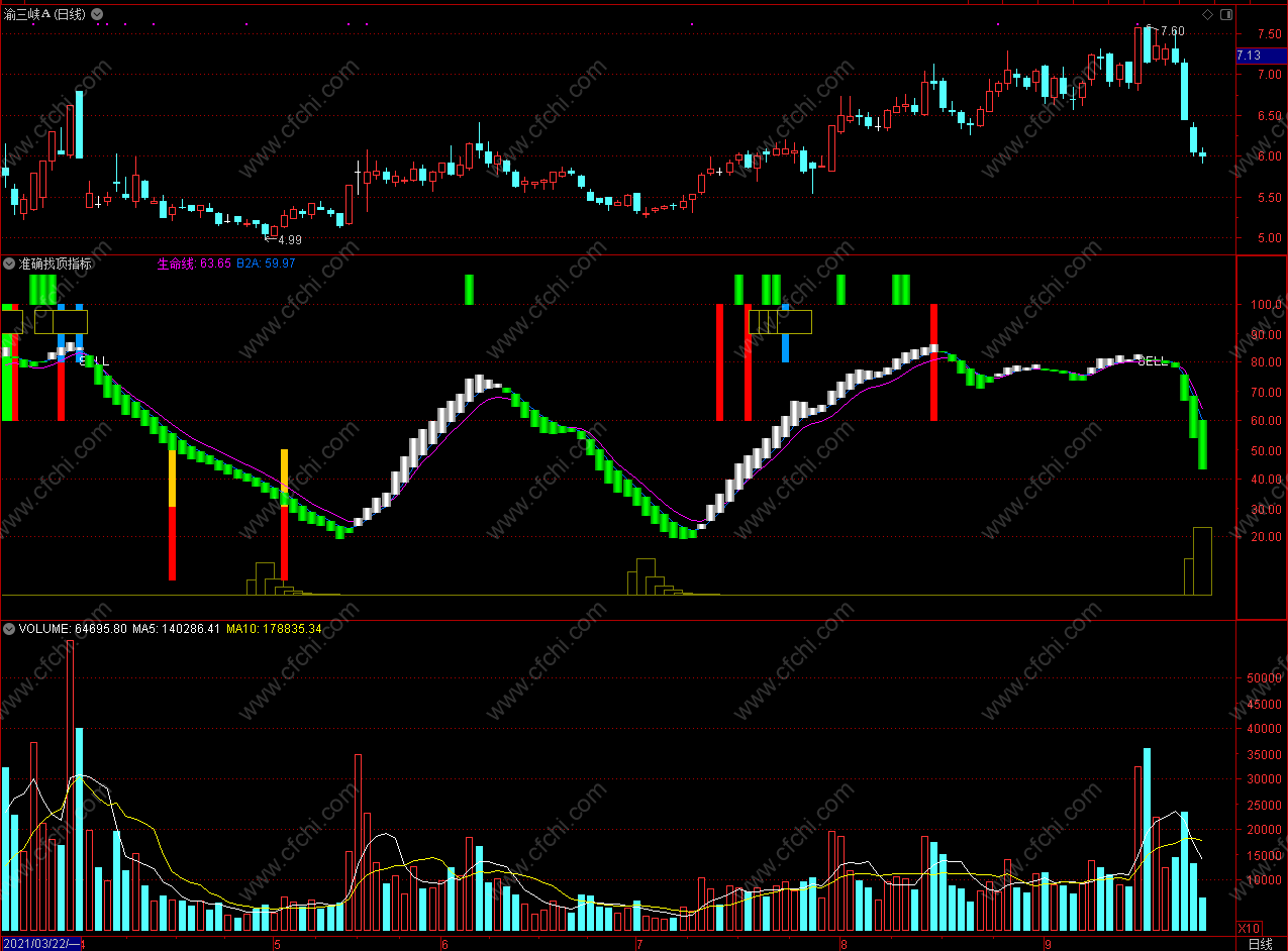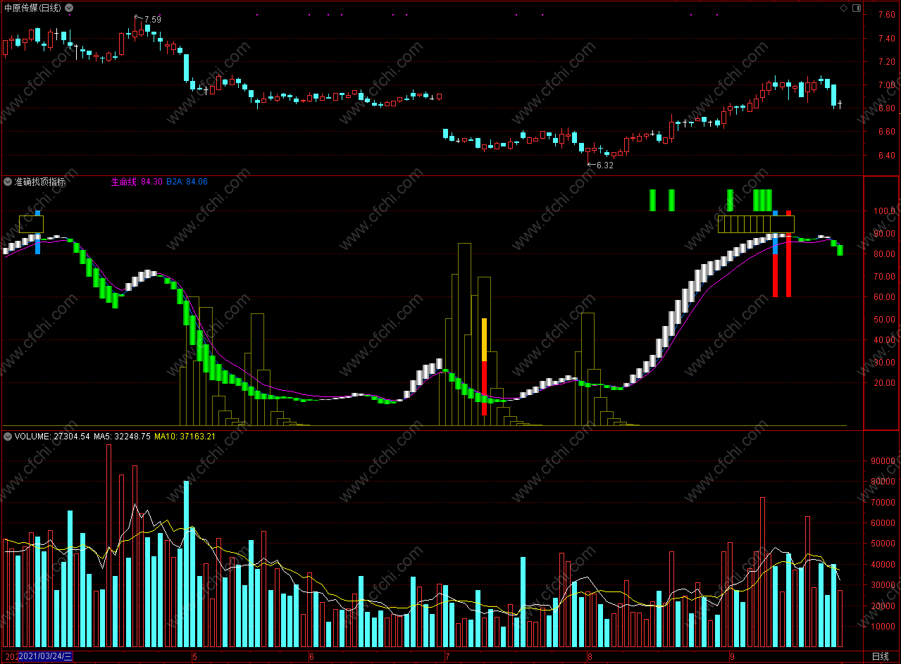 指标分上中下,上面是绿的柱是预警,红色或者蓝色柱是卖出位子;