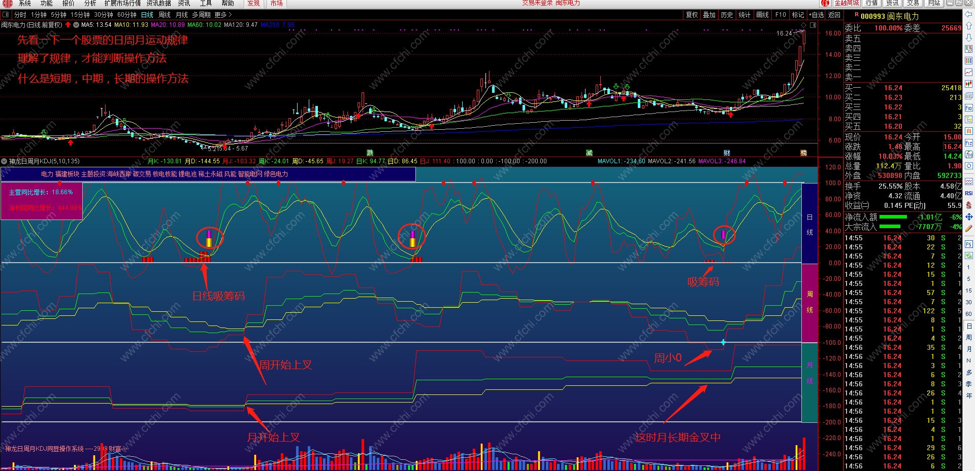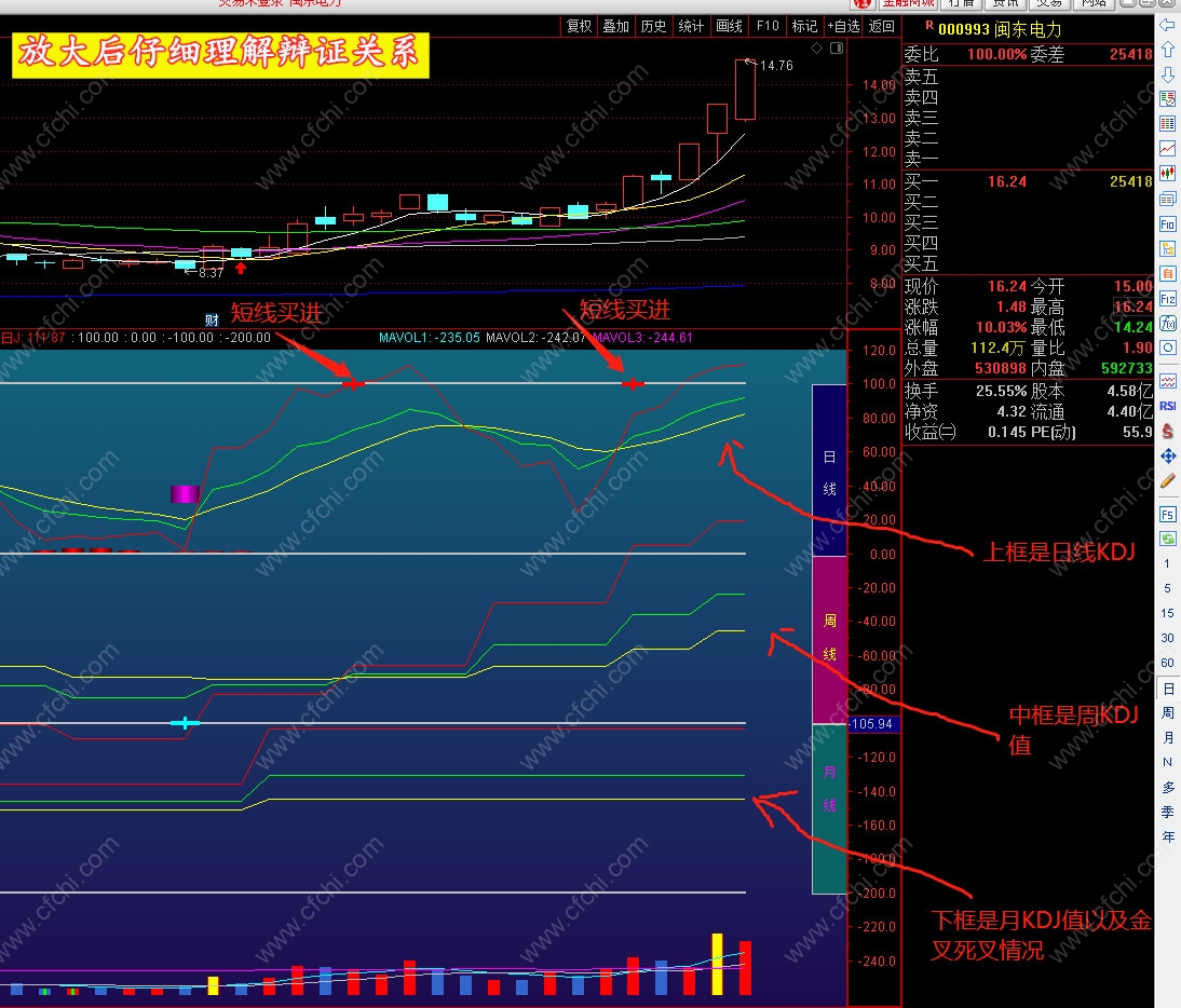 一般的朋友看到日KDJ低了,买进,由于日周期太短,没有关注周的情况和月的关系,钝化底部绵绵下跌,但采用我们这样的看盘方法,你一定能买到最低。底部知道了,我们想高点就不用多说,一样也能理解,无非是底部 头部的关系。