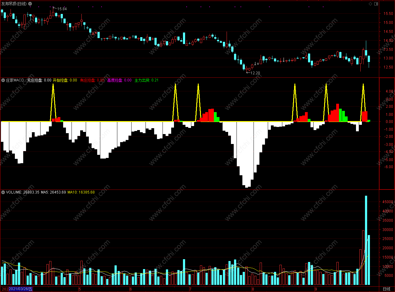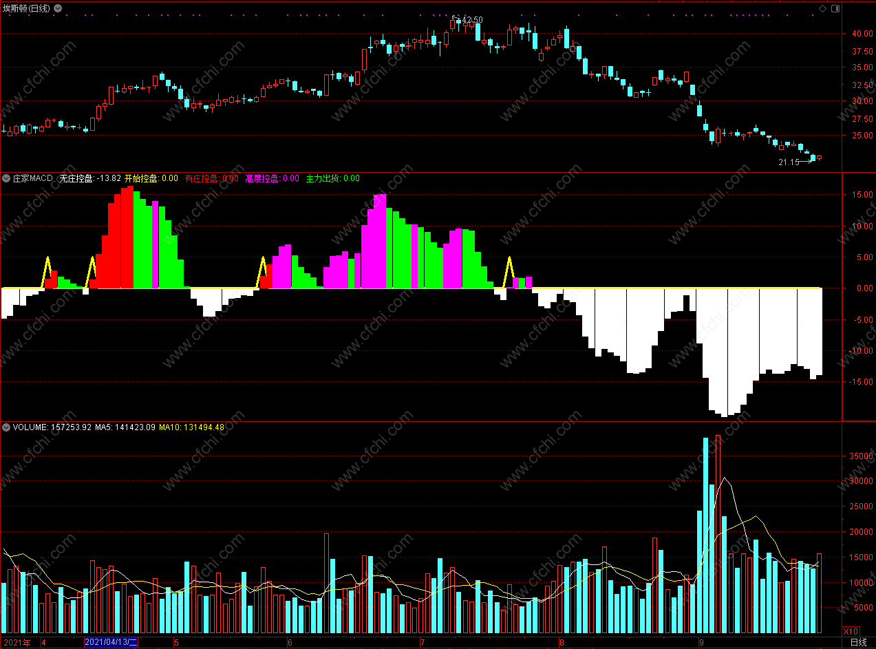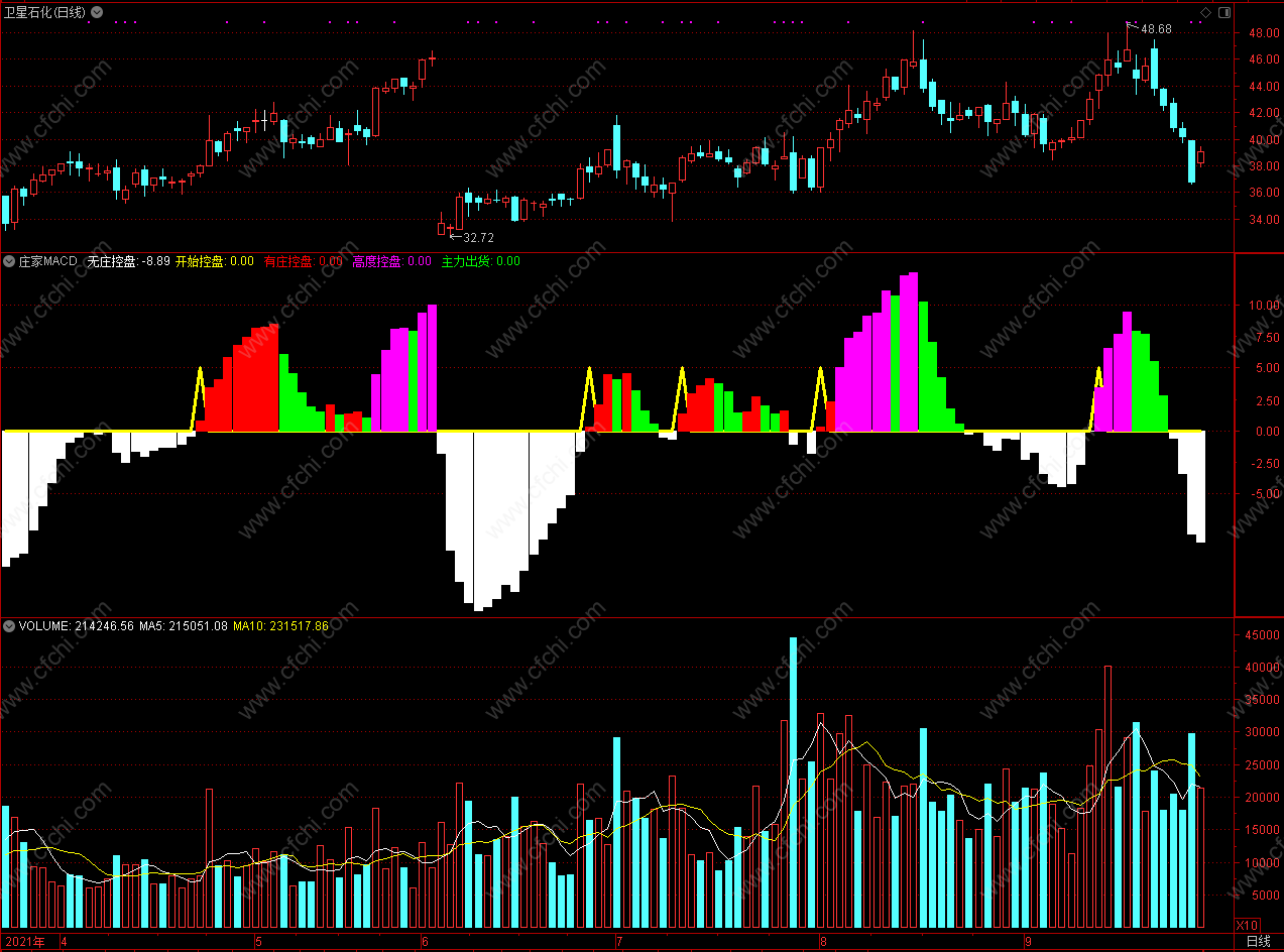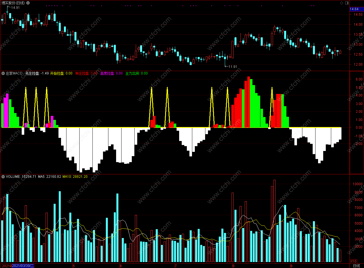 此指标白色柱子是无庄控盘,红色柱子是有庄控盘,绿色柱子是主力出货;