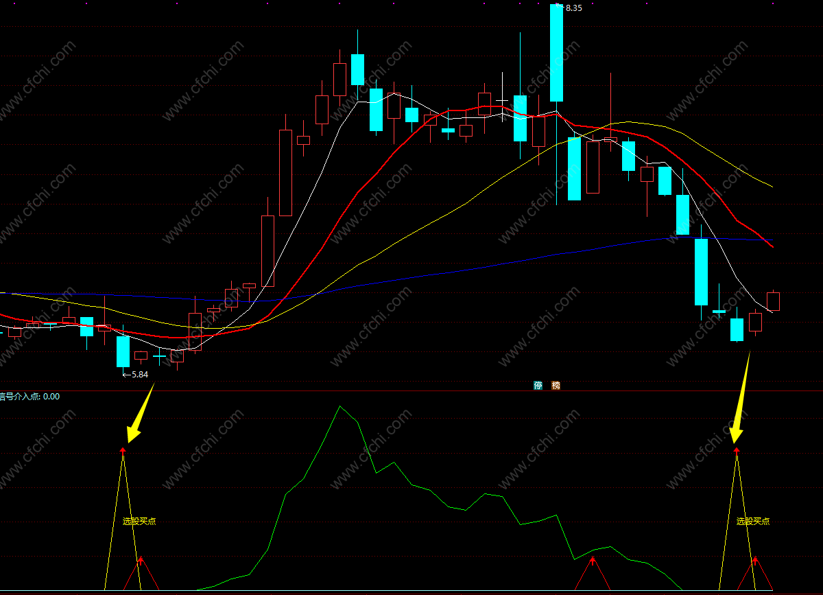 黑马信号介入点:选股买点 AND VARF AND VARC AND VAR21 AND VAR4<0 AND VAR5<2 AND VAR6=0,COLORFFFF99;