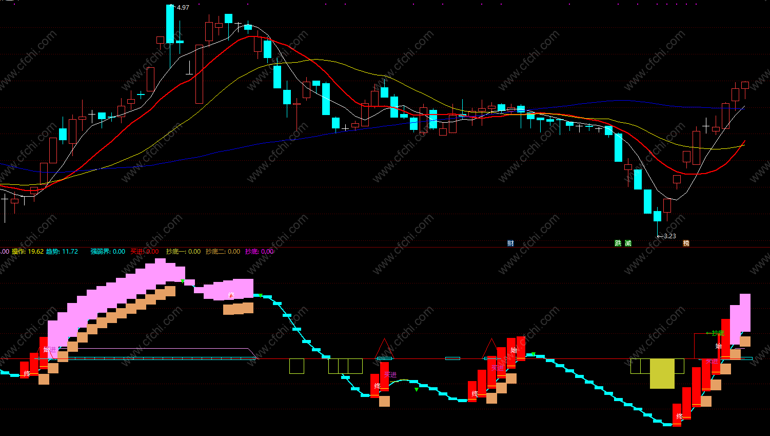 趋势:EMA(0.618*REF(操作,1)+0.382*操作,3),COLORFFFF00,LINETHICK2;