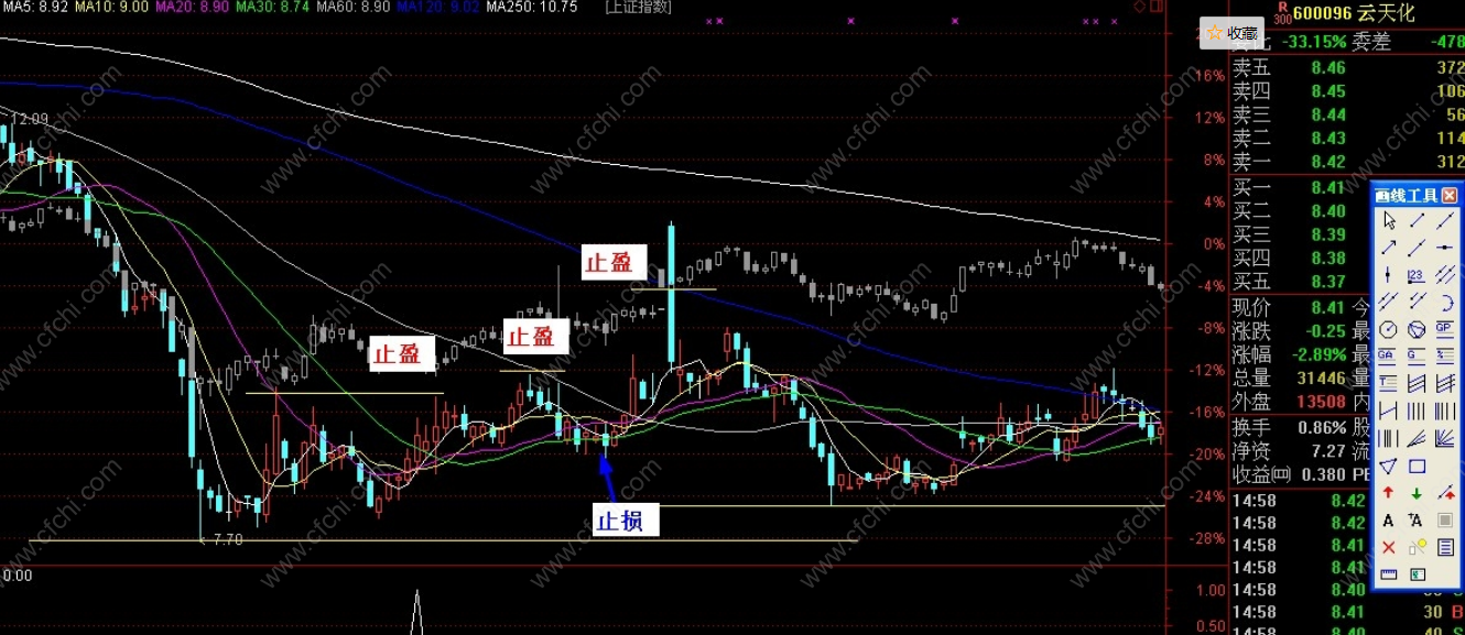 (4) 止损:跌5%、跌破原上升均线、跌破所有均线(根据实际情况而定)